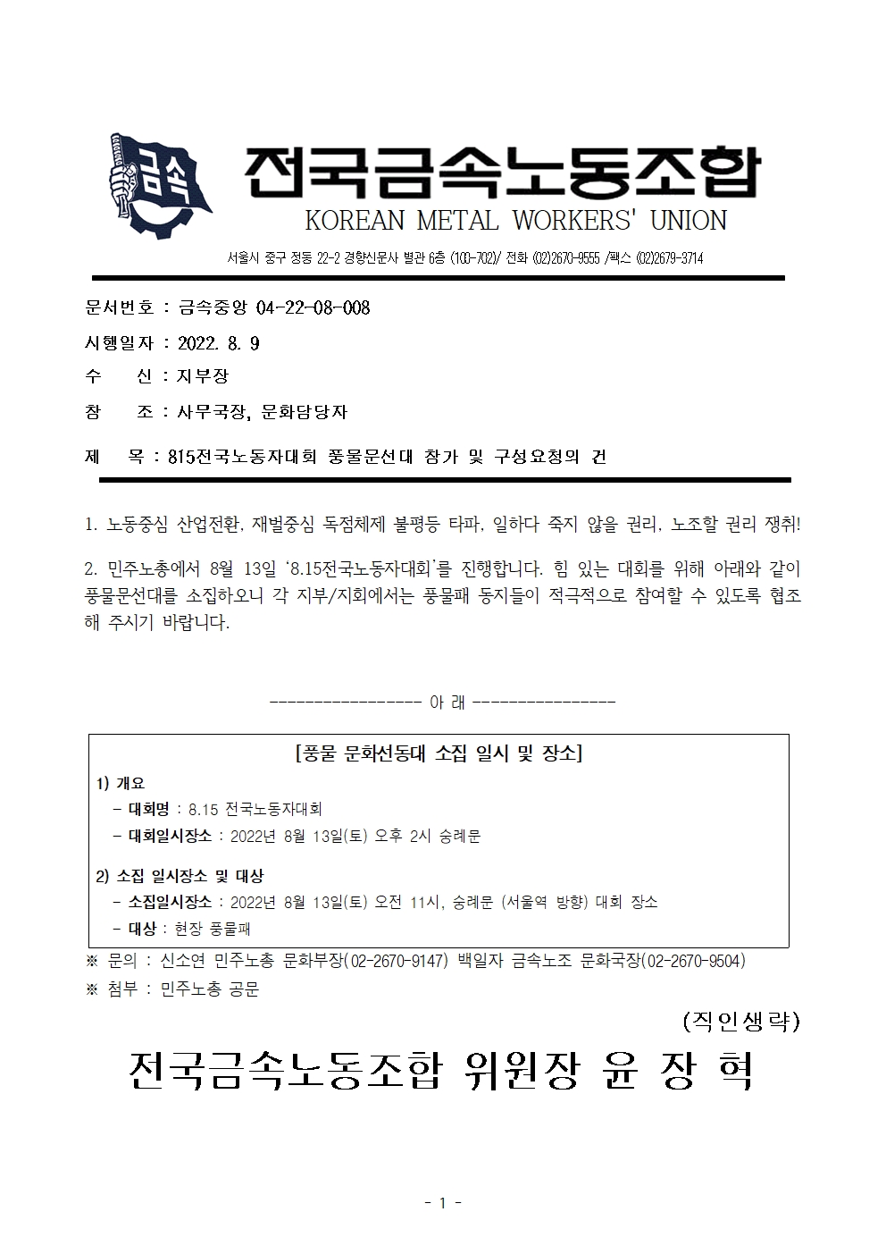 2022³â 8¿ù 10ÀÏ(¼ö) 8.15Àü±¹³ëµ¿ÀÚ´ëȸ dz¹°¹®¼±´ë Âü°¡ ¹× ±¸¼º¿äû °Ç