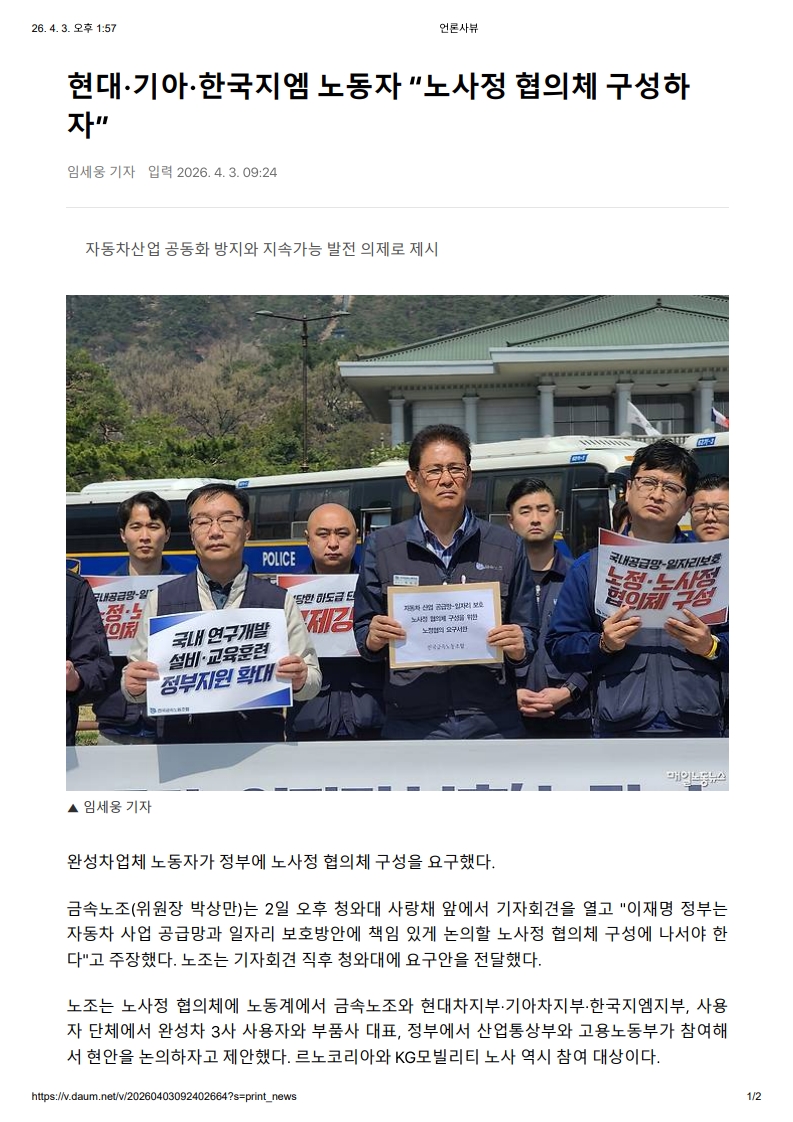 Çö´ë¡¤±â¾Æ¡¤Çѱ¹Áö¿¥ ³ëµ¿ÀÚ ¡°³ë»çÁ¤ ÇùÀÇü ±¸¼ºÇÏÀÚ¡±