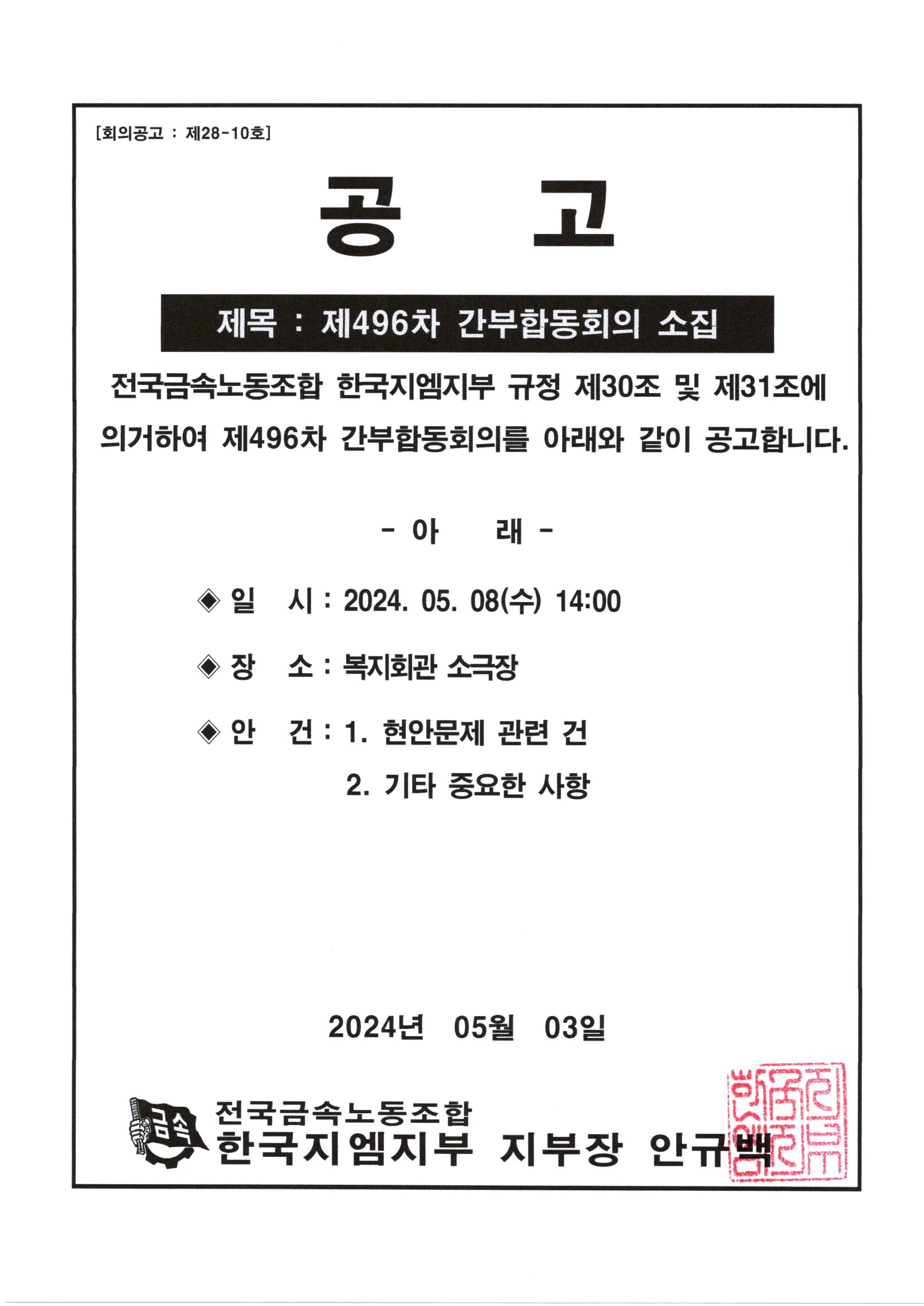 Á¦496Â÷ °£ºÎÇÕµ¿È¸ÀÇ ¼ÒÁý°ø°í