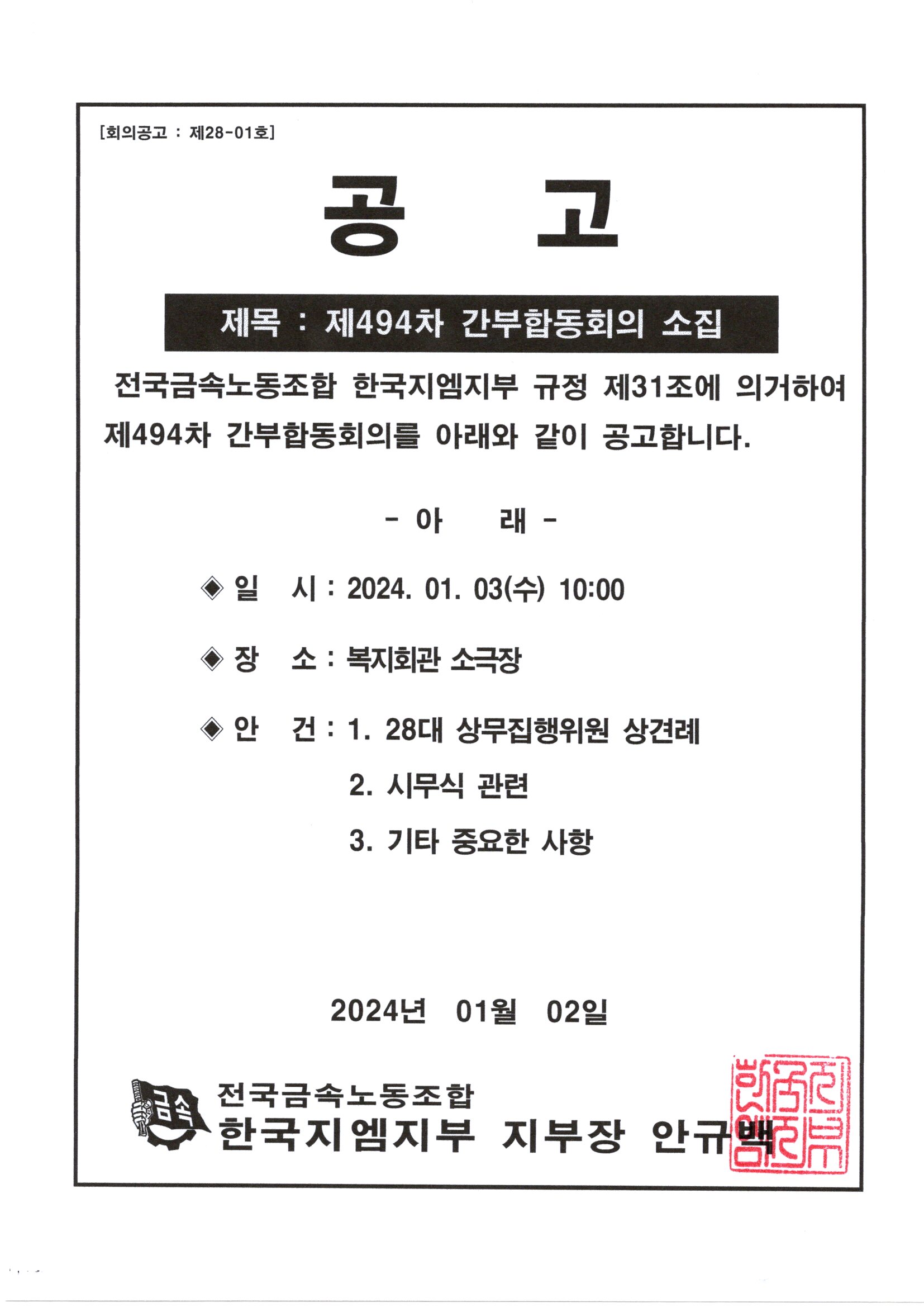 Á¦494Â÷ °£ºÎÇÕµ¿È¸ÀÇ ¼ÒÁý°ø°í