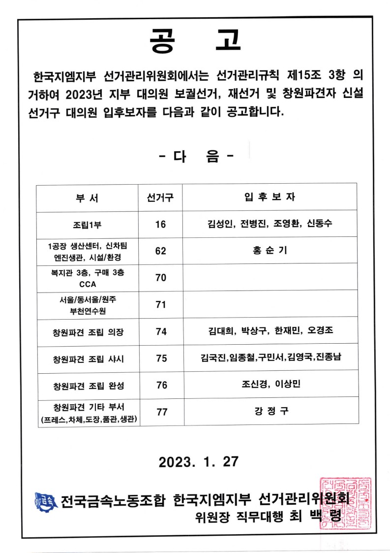 2023³âµµ Àü±¹±Ý¼Ó³ëµ¿Á¶ÇÕ ´ëÀÇ¿ø ¼±°Å ÀÏÁ¤ °ø°í