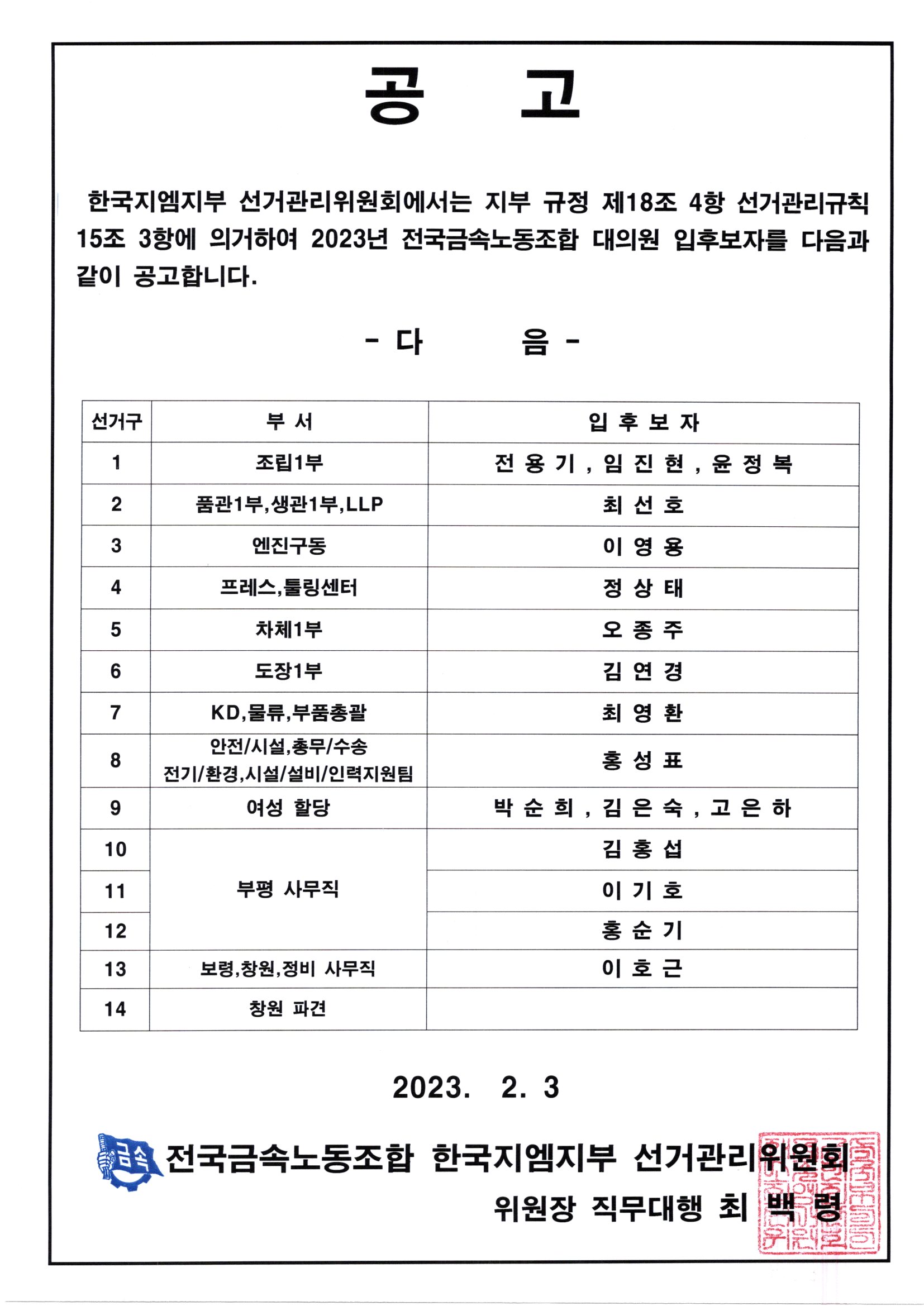2023³âµµ Àü±¹±Ý¼Ó³ëµ¿Á¶ÇÕ ´ëÀÇ¿ø ¼±°Å ÀÏÁ¤ °ø°í