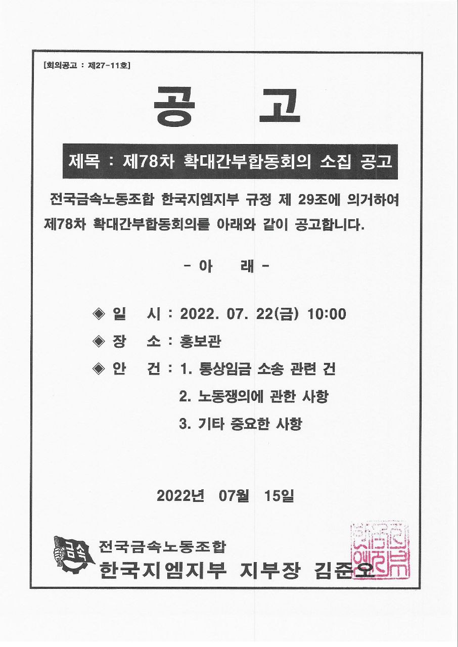 Á¦78Â÷ È®´ë°£ºÎÇÕµ¿È¸ÀÇ ¼ÒÁý °ø°í ȸÀǰá°ú