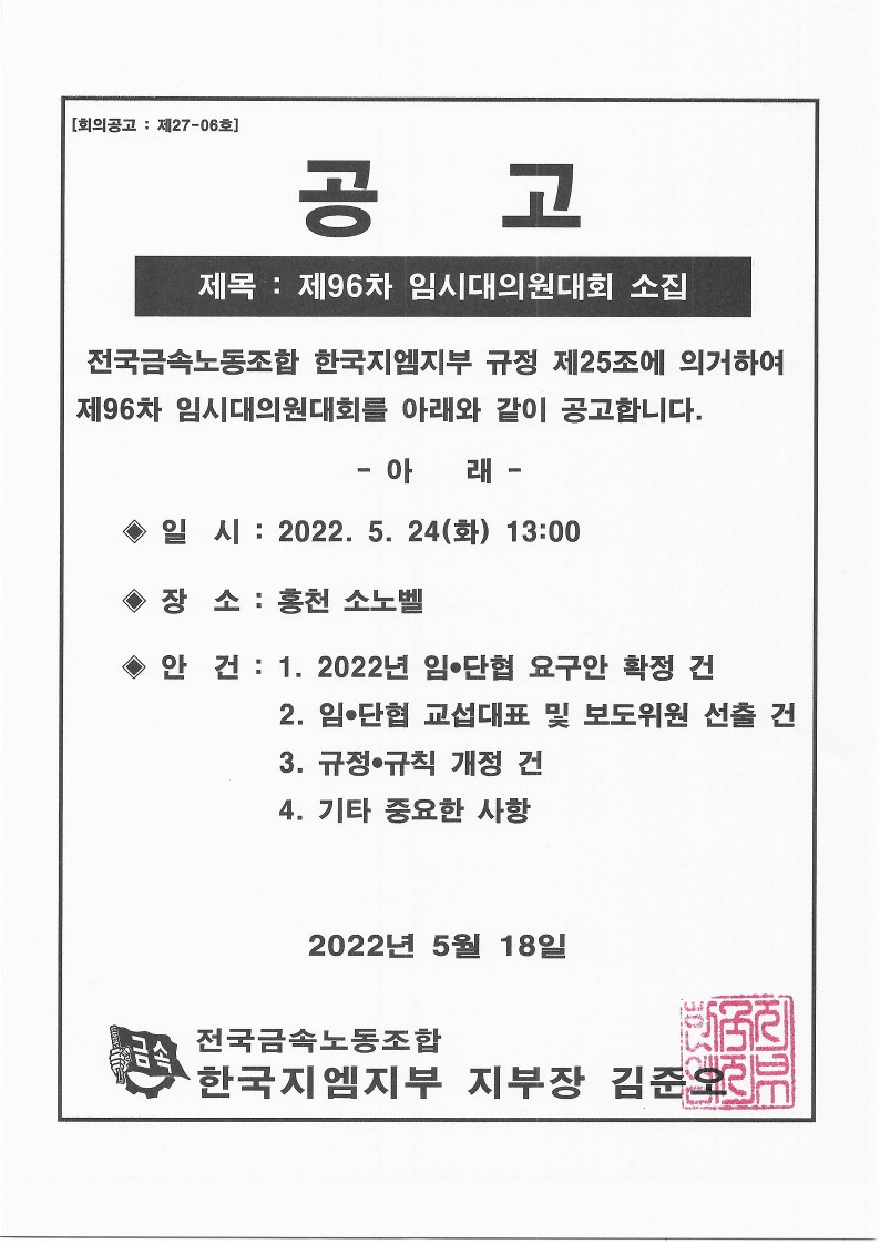 2022³â Àü±¹±Ý¼Ó³ëµ¿Á¶ÇÕ ´ëÀÇ¿ø ¼±°Å ÀÏÁ¤ °ø°í