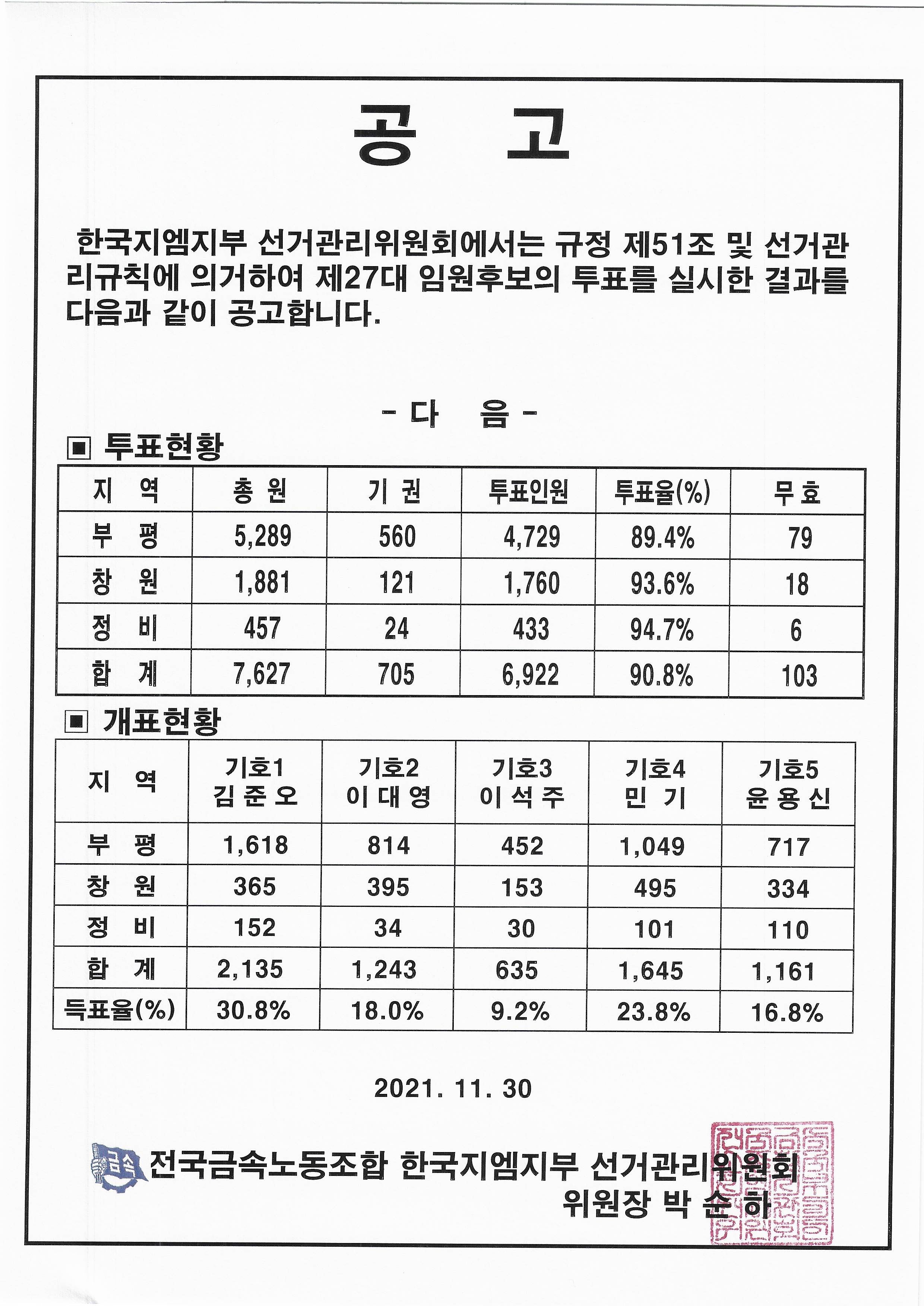 (°ø°í)Á¦27´ë ÀÓ¿ø¼±°Å °á¼± ÅõÇ¥ °á°ú