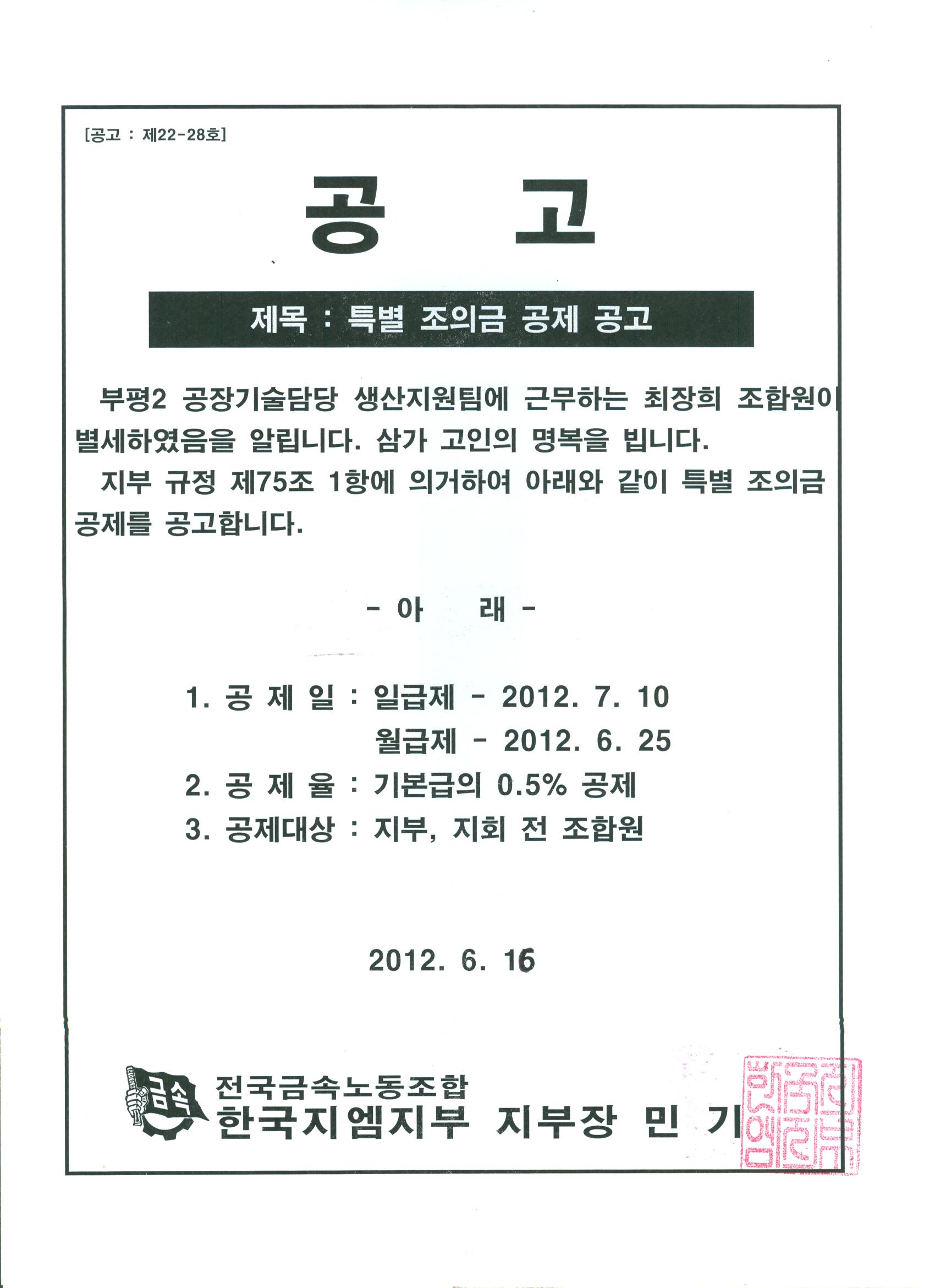 ºÎÆò 2°øÀå ±â¼ú´ã´ç »ý»êÁö¿øÆÀ ÃÖÀåÈñ Á¶ÇÕ¿ø Ưº°Á¶ÀÇ±Ý °ø°í