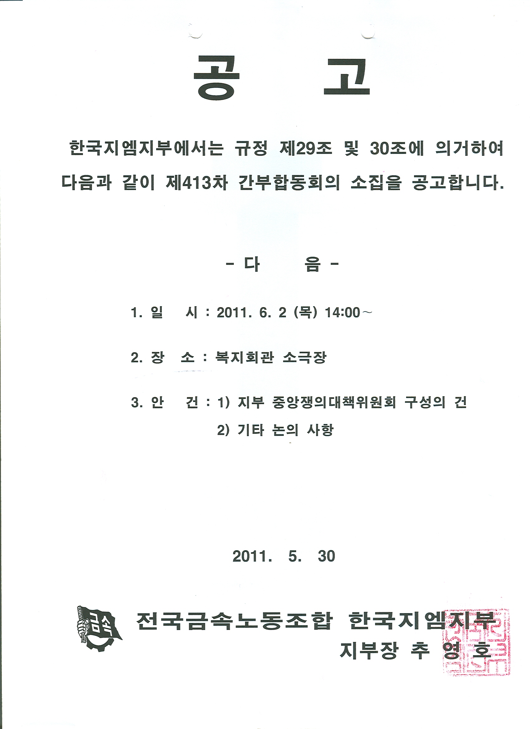 [°ø°í] Á¦413Â÷ °£ºÎÇÕµ¿È¸ÀÇ °ø°í