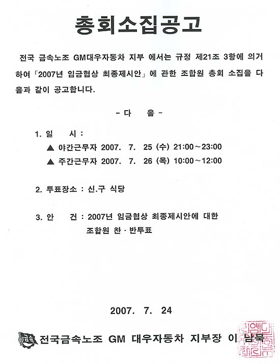 [°ø°í] 2007³â ÀÓ±ÝÇù»ó ÃÖÁ¾Á¦½Ã¾È¿¡ ´ëÇÑ Á¶ÇÕ¿ø ÃÑȸ ¼ÒÁý°ø°í