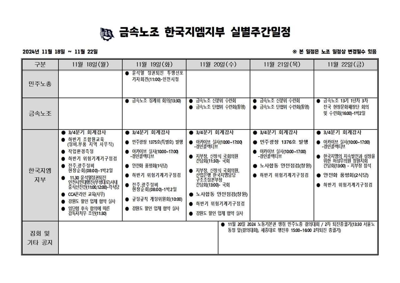 2024³â 11¿ù18ÀÏ ~11¿ù22ÀÏ ÁÖ°£ÀÏÁ¤Ç¥ÀÔ´Ï´Ù
