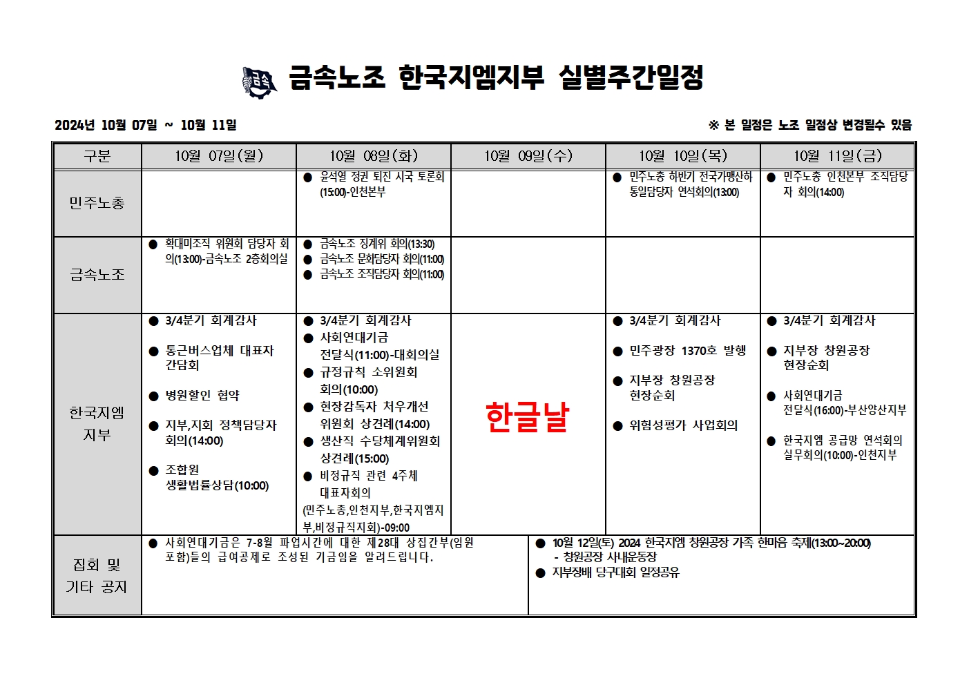 2024³â 10¿ù07ÀÏ ~10¿ù11ÀÏ ÁÖ°£ÀÏÁ¤Ç¥ÀÔ´Ï´Ù