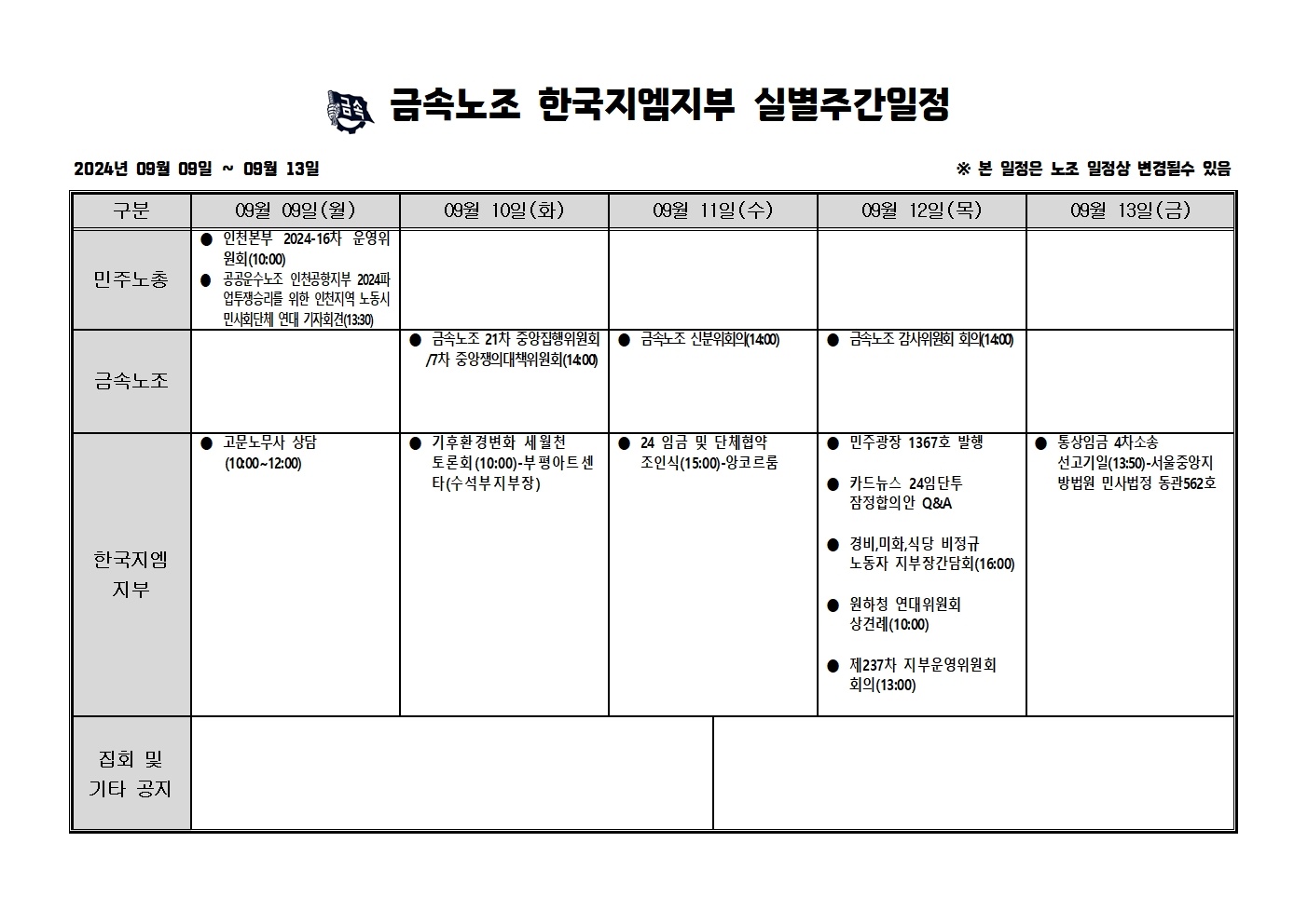 2024³â 09¿ù09ÀÏ ~09¿ù13ÀÏ ÁÖ°£ÀÏÁ¤Ç¥ÀÔ´Ï´Ù