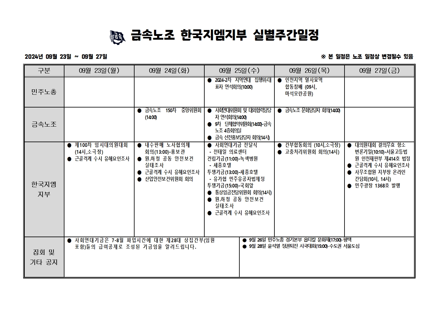 2024³â 09¿ù23ÀÏ ~09¿ù27ÀÏ ÁÖ°£ÀÏÁ¤Ç¥ÀÔ´Ï´Ù