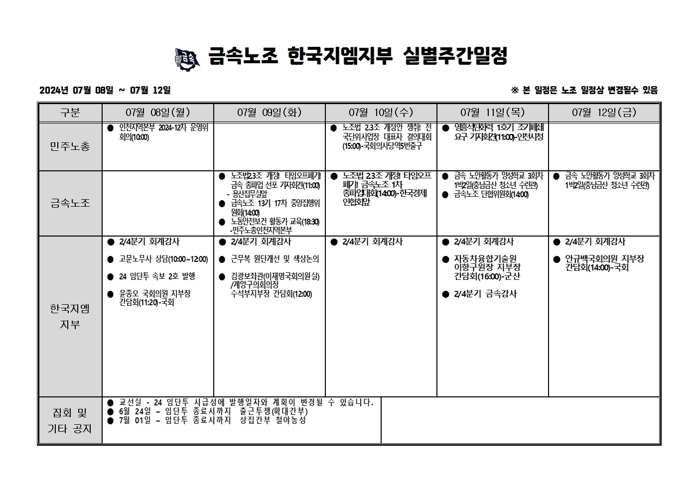 2024³â 07¿ù08ÀÏ ~07¿ù12ÀÏ ÁÖ°£ÀÏÁ¤Ç¥ÀÔ´Ï´Ù