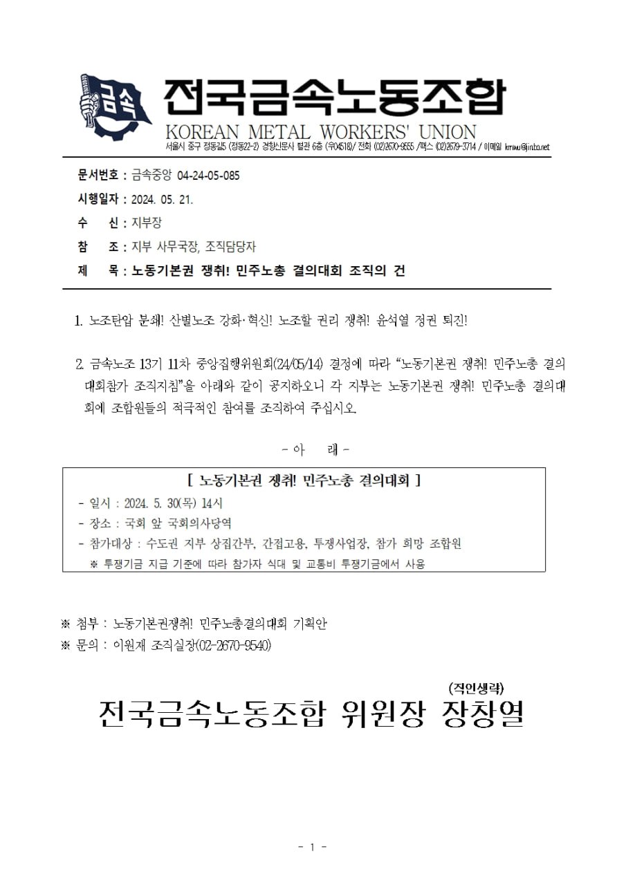 (5/30) ³ëµ¿±âº»±Ç ÀïÃë! ¹ÎÁÖ³ëÃÑ °áÀÇ´ëȸ Á¶Á÷