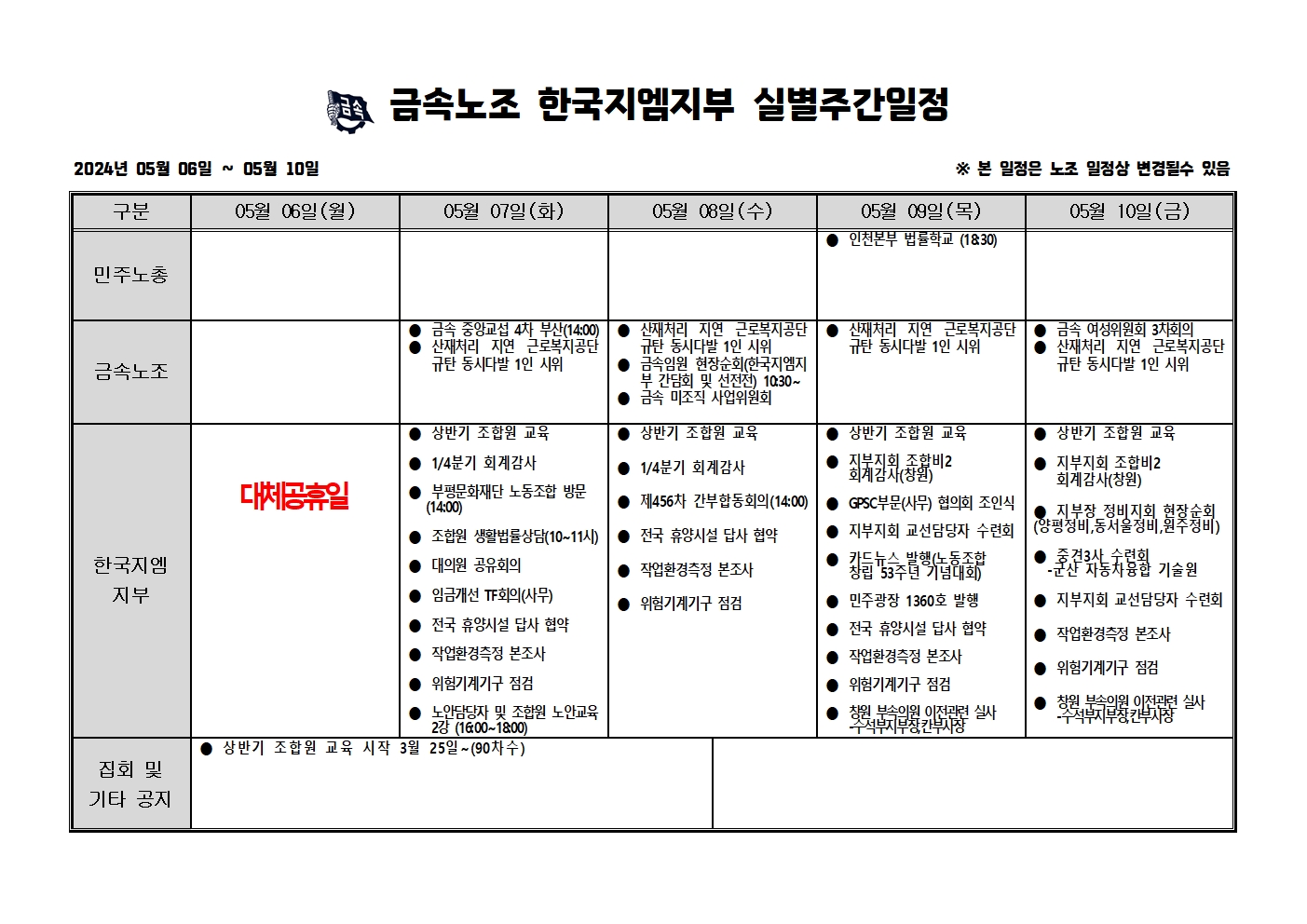 2024³â 05¿ù06ÀÏ ~05¿ù10ÀÏ ÁÖ°£ÀÏÁ¤Ç¥ÀÔ´Ï´Ù