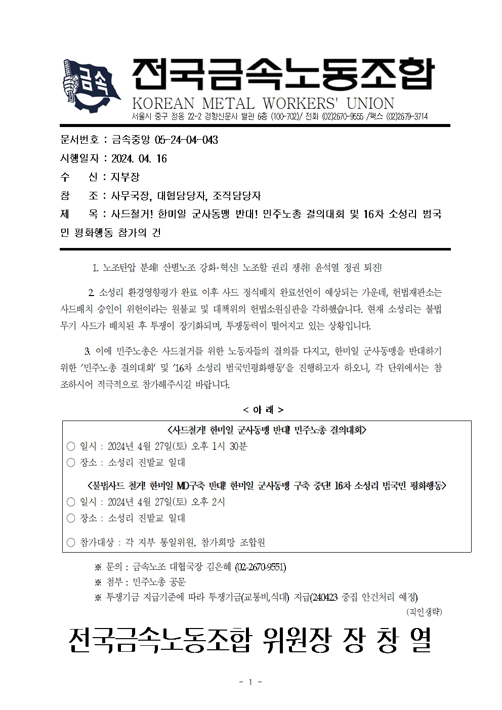 »çµåö°Å! ÇѹÌÀÏ ±º»çµ¿¸Í ¹Ý´ë! ¹ÎÁÖ³ëÃÑ °áÀÇ´ëȸ ¹× 16Â÷ ¼Ò¼º¸® ¹ü±¹¹Î ÆòÈÇൿ Âü°¡ (4/27)