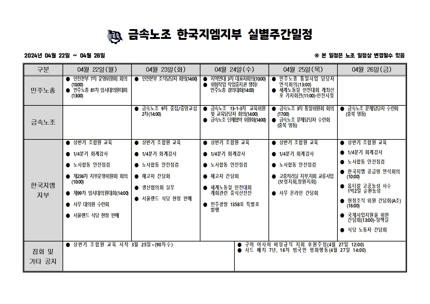 2024³â 04¿ù22ÀÏ ~04¿ù26ÀÏ ÁÖ°£ÀÏÁ¤Ç¥ÀÔ´Ï´Ù