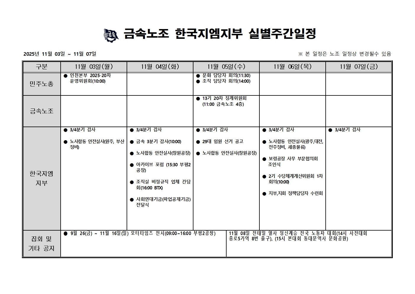 2025³â 11¿ù 3ÀÏ ~ 11¿ù 7ÀÏ ÁÖ°£ÀÏÁ¤Ç¥ ÀÔ´Ï´Ù