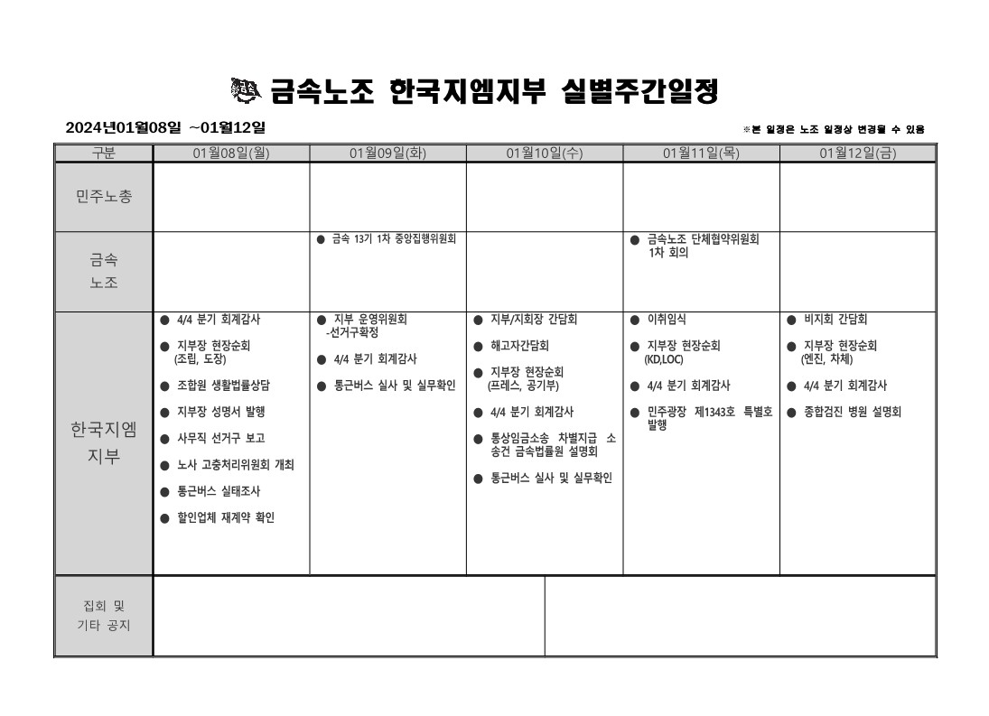 2024³â 01¿ù08ÀÏ ~ 01¿ù12ÀÏ ÁÖ°£ÀÏÁ¤Ç¥ÀÔ´Ï´Ù