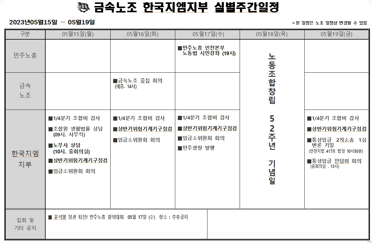2023³â 05¿ù15ÀÏ ~ 05¿ù19ÀÏ ÁÖ°£ÀÏÁ¤Ç¥ÀÔ´Ï´Ù