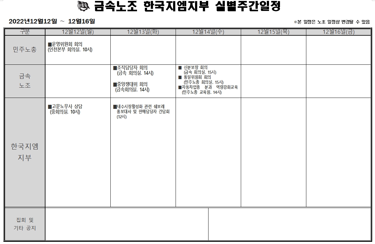 2022³â 12¿ù12ÀÏ ~ 12¿ù16ÀÏ ÁÖ°£ÀÏÁ¤Ç¥ÀÔ´Ï´Ù