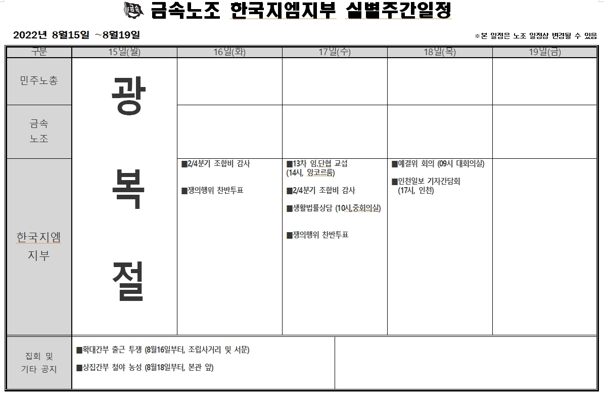 2022³â 08¿ù15ÀÏ ~ 08¿ù19ÀÏ ÁÖ°£ÀÏÁ¤Ç¥ÀÔ´Ï´Ù