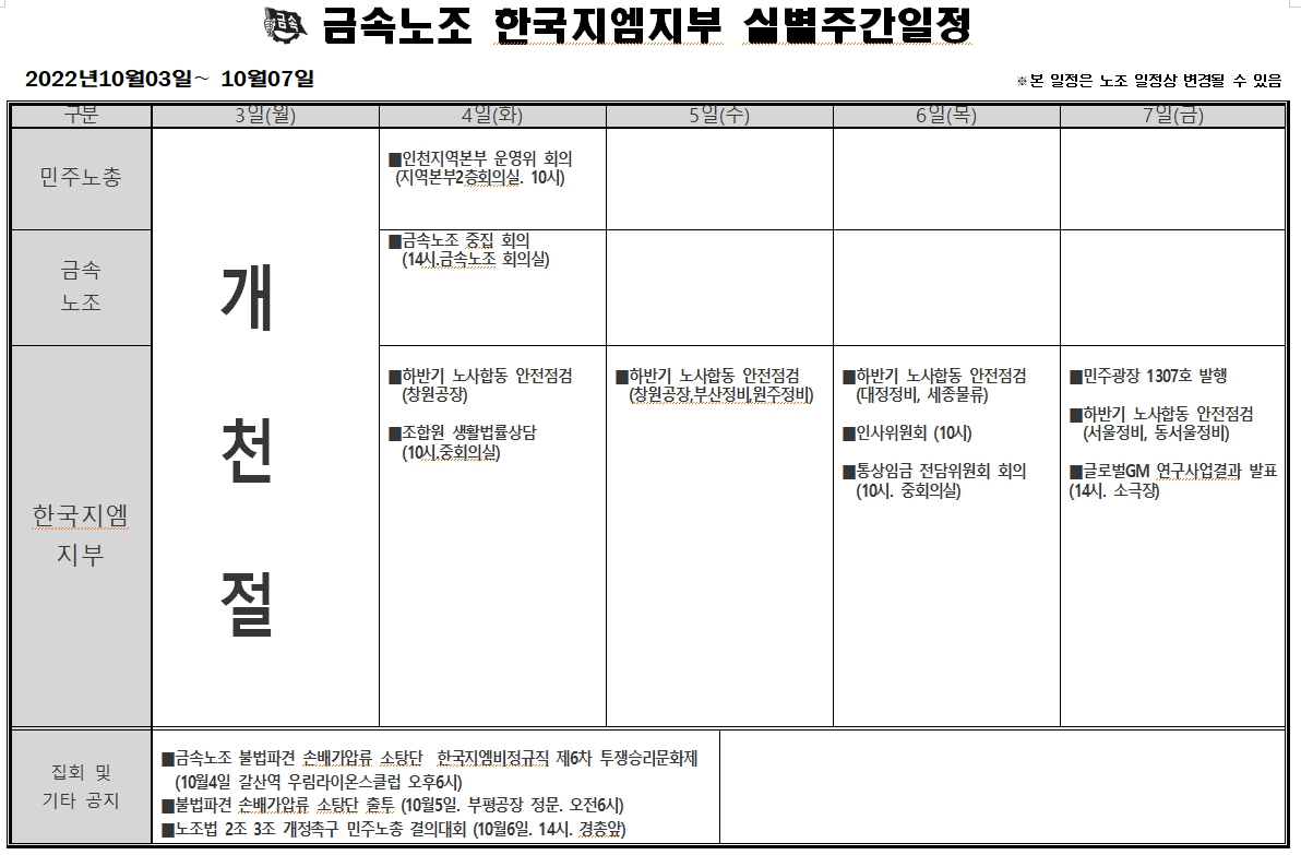 2022³â 10¿ù03ÀÏ ~ 10¿ù07ÀÏ ÁÖ°£ÀÏÁ¤Ç¥ÀÔ´Ï´Ù
