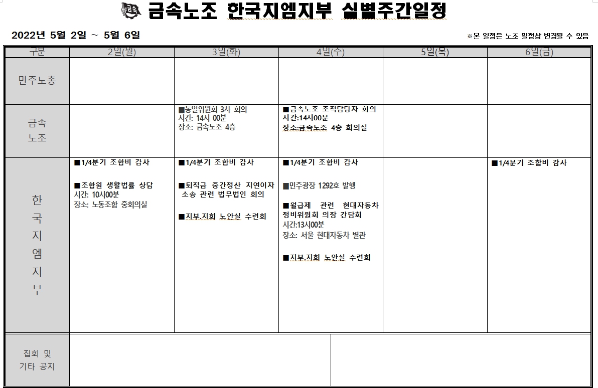 2022³â 05¿ù02ÀÏ ~ 05¿ù06ÀÏ ÁÖ°£ÀÏÁ¤Ç¥ÀÔ´Ï´Ù