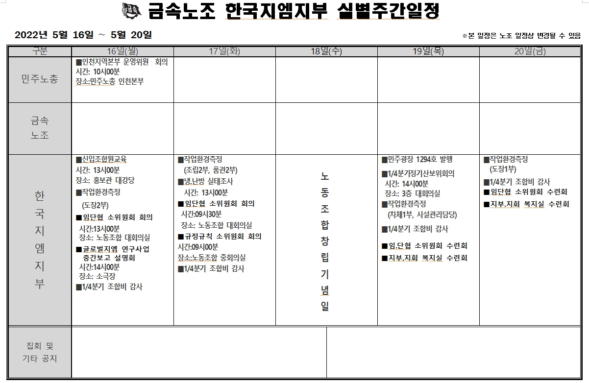 2022³â 05¿ù16ÀÏ ~ 05¿ù20ÀÏ ÁÖ°£ÀÏÁ¤Ç¥ÀÔ´Ï´Ù