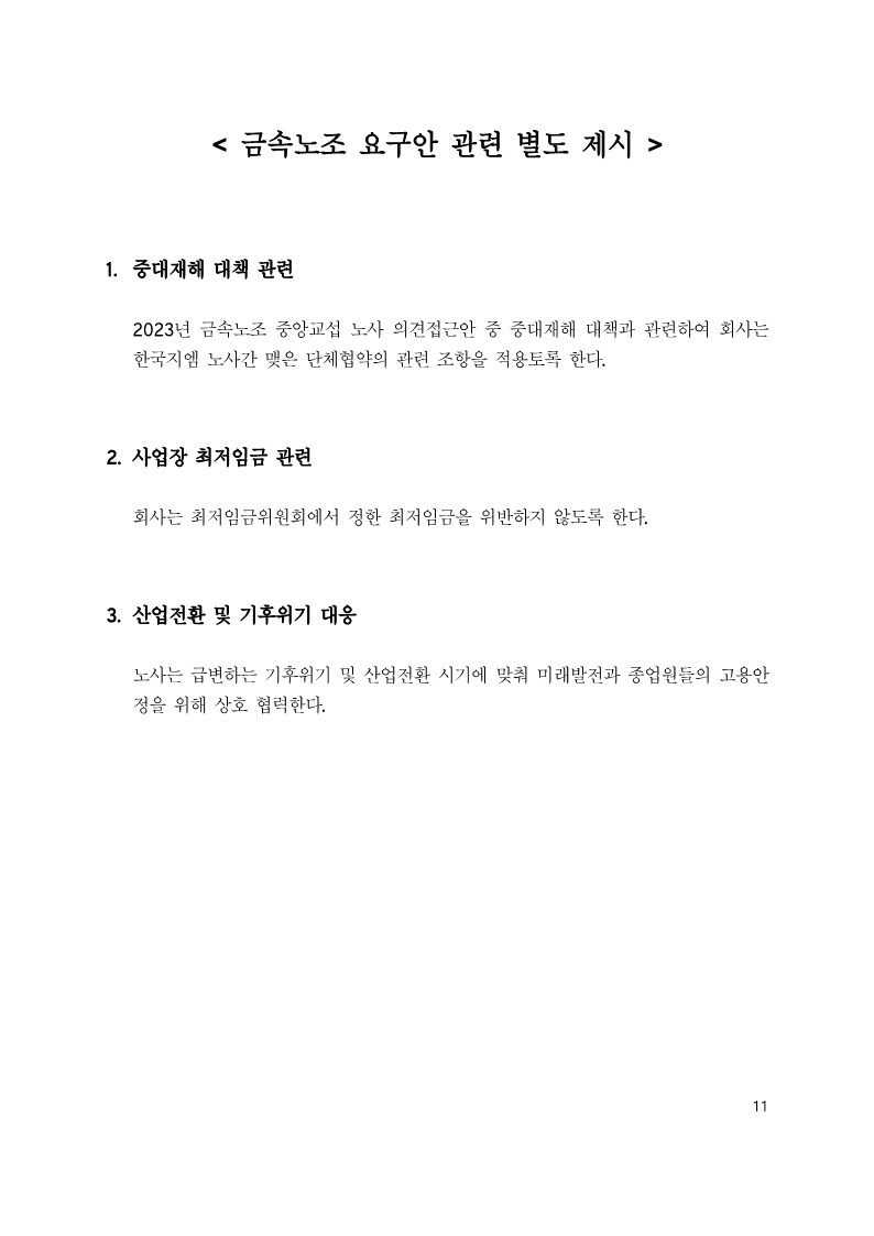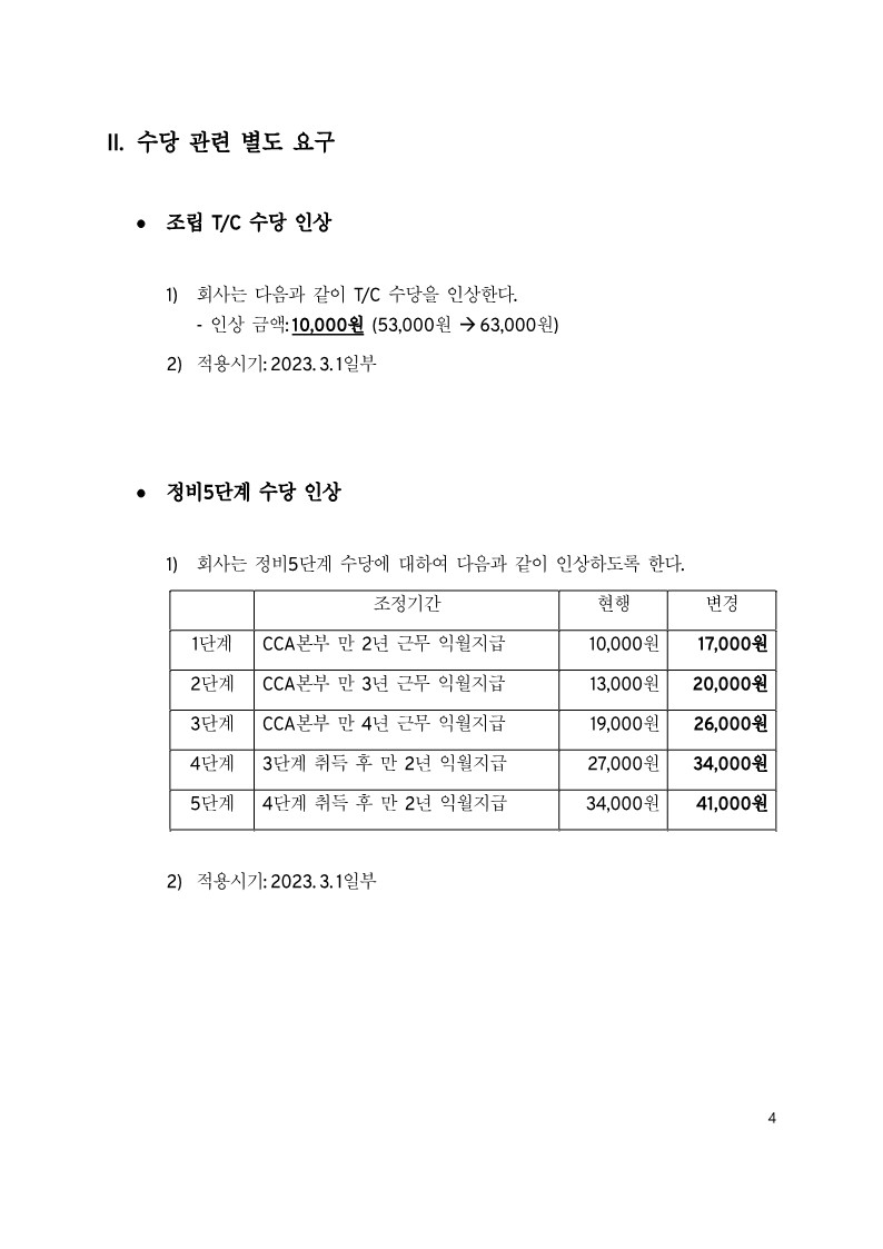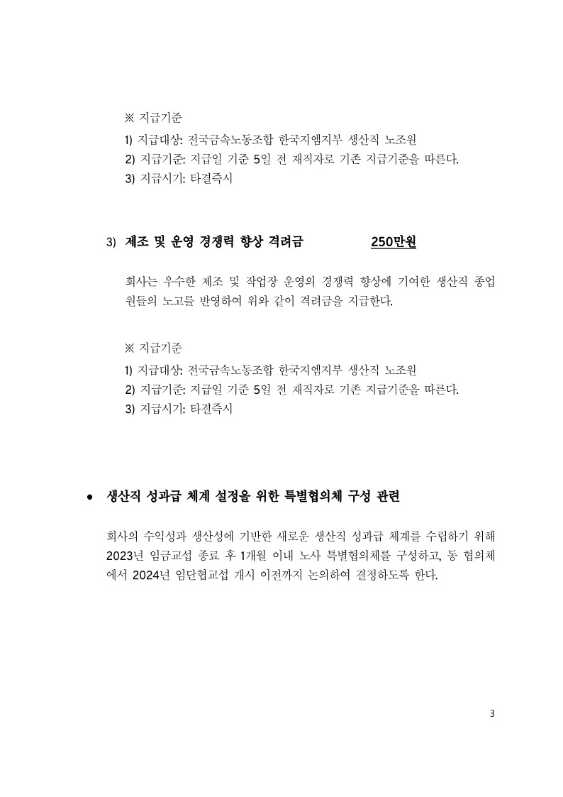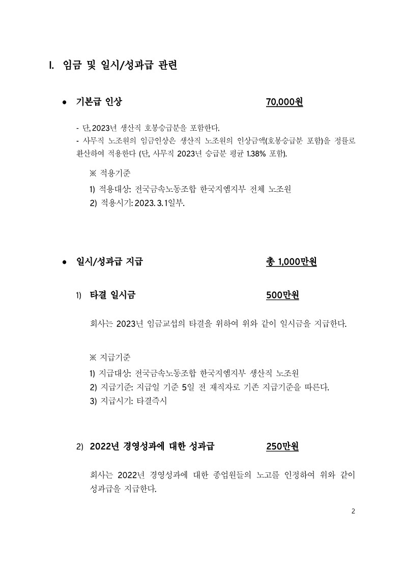 »çÃø ´ëÇ¥ : ±âº»±Þ Àλó 70,000¿ø Àλó Á¦½Ã, ÀϽÃ/¼º°ú±Þ Áö±Þ 1,000¸¸¿ø (Ÿ°á ÀÏ½Ã±Ý 500¸¸¿ø, ¼º°ú±Þ 250¸¸¿ø, °Ý·Á±Ý 250¸¸¿ø) Áö±Þ½Ã±â Ÿ°á Áï½Ã. Á¤ºñ 5´Ü°è ¼ö´ç °¢ ´Ü°è 7,000¿ø Àλó Á¦½Ã. ±Ý¼Ó³ëÁ¶ ¿ä±¸¾È °ü·Ã º°µµ Á¦½Ã(Áß´ëÀçÇØ °ü·Ã, »ç¾÷Àå ÃÖÀúÀÓ±Ý °ü·Ã, »ê¾÷Àüȯ ¹× ±âÈÄÀ§±â ´ëÀÀ) ºÎÁ·ÇÑ Á¡ÀÌ ÀÖ´õ¶óµµ ³ëÃøÀÇ °á´ÜÀ» ºÎŹÇÑ´Ù.