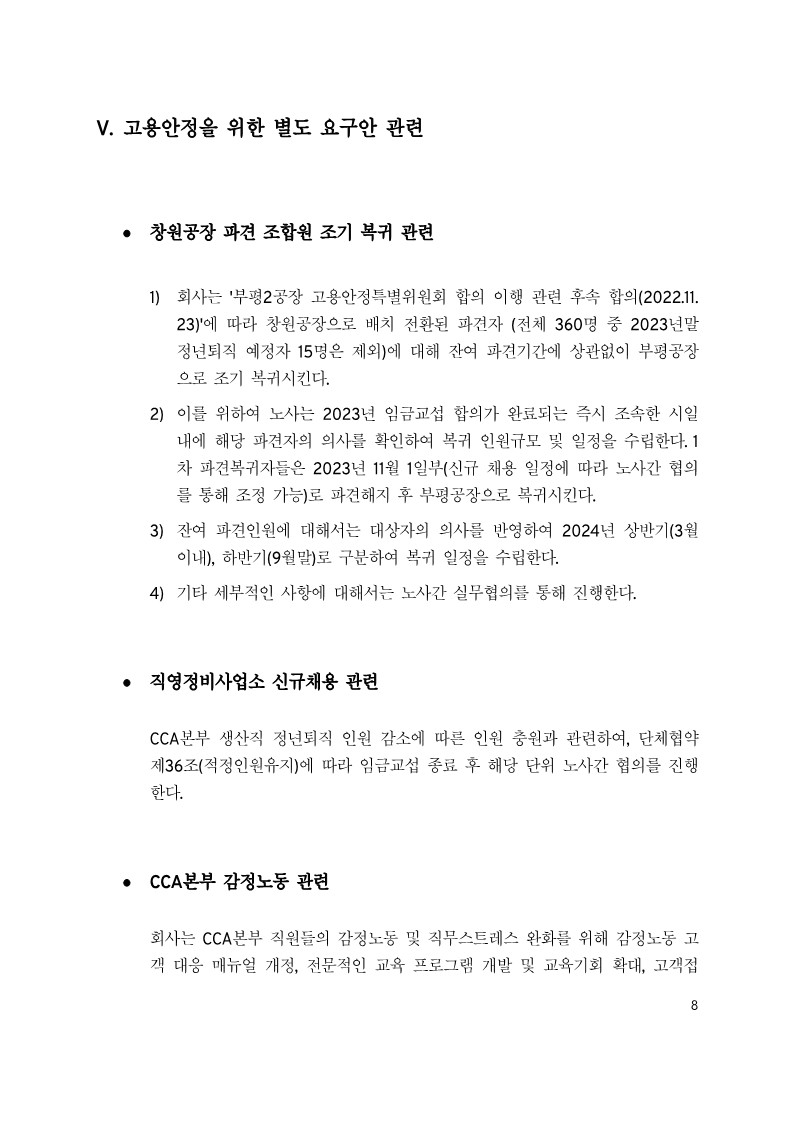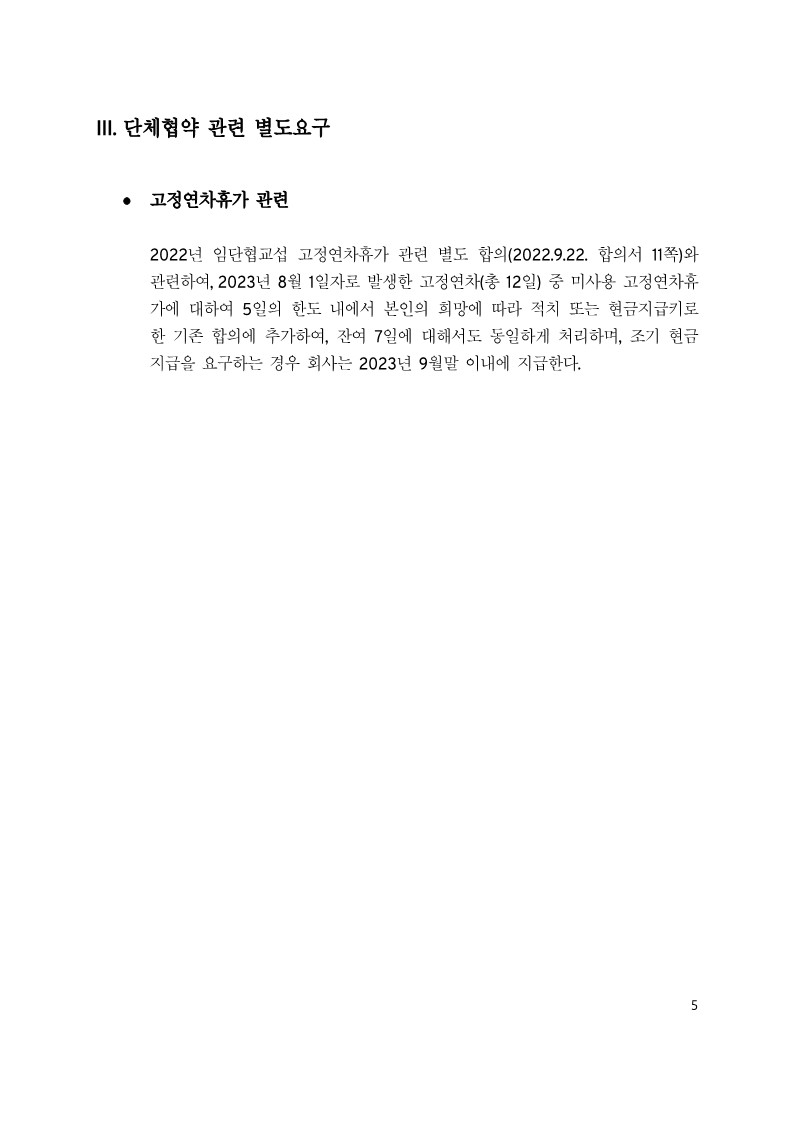 »çÃø ´ëÇ¥ : µÎ°¡Áö ºÎºÐÀ» Ãß°¡ÇÏ¿© ÃÖÁ¾Á¦½Ã¾È Á¦ÃâÇÑ´Ù. ¸ÕÀú °íÁ¤¿¬Â÷ÈÞ°¡ ºÎºÐÀÌ´Ù. ±âÁ¸ ÇÕÀÇ(5°³ ÀûÄ¡ ¶Ç´Â Çö±ÝÁö±Þ)¿¡ Ãß°¡ÇÏ¿© ÀÜ¿© 7ÀÏ¿¡ ´ëÇØ¼µµ Á¶±â Çö±Ý Áö±Þ 23³â 9¿ù¸» À̳»¿¡ Áö±Þ. ÇØ´ç°¡Ä¡´Â Æò±Õ 100¸¸¿ø Á¤µµ. ÇØ°íÀÚ °ü·Ã Ãß°¡ Á¦½Ã. ÇØ°íÀÚ ¹®Á¦ ÇØ°áÃ¥À» ã±â À§ÇØ Áö¼ÓÀûÀ¸·Î ³ëµ¿Á¶ÇÕ°ú ¼º½ÇÈ÷ ÇùÀÇÇÑ´Ù. °ø½ÄÀûÀÎ ¹®±¸·Î ÇØ°íÀÚ º°µµ ¿ä±¸¿¡ ´äº¯ Á¦Ãâ