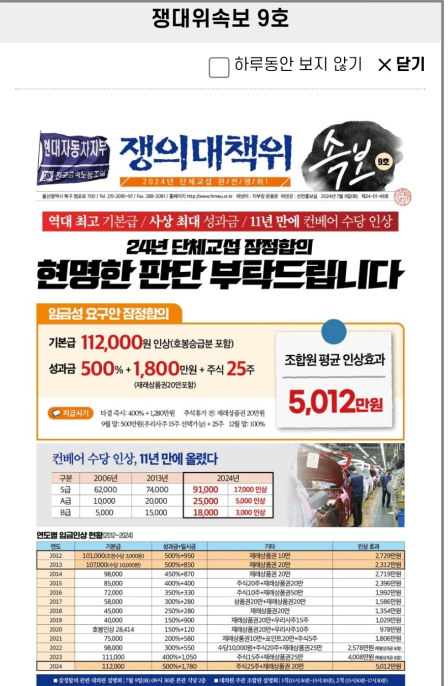 ¿ÃÇØ Çö´ë¸ðºñ½º ³ë»ç°¡ ÀáÁ¤ ÇÕÀÇÇÑ ³»¿ëÀº ±âº»±Þ 11¸¸2000¿ø(È£ºÀ½Â±ÞºÐ Æ÷ÇÔ) Àλó, ¼º°ú±Ý ¹× °Ý·Á±Ý 500%+1520¸¸¿ø+ÁÖ½Ä 36ÁÖ+¿ì¸®»çÁÖÃ⿬ ¸®¿öµå100¸¸~150¸¸¿ø µîÀÌ´Ù. 2024³â °æ¿µ¼º°ú±ÝÀº 400%+1000¸¸¿ø(º» Çù¾à ü°á Áï½Ã), Àӱݱ³¼· Ÿ°á °ü·Ã º°µµ ÇÕÀÇ 5ÁÖ(9¿ù¸»), 2024³â Çٽɰ濵¸ñÇ¥ ´Þ¼º °Ý·Á±Ý 100%+11ÁÖ(12¿ù), ±Û·Î¹ú ¼öÁÖÈ®´ë °Ý·Á±Ý 500¸¸¿ø+20ÁÖ(9¿ù¸»), Àç·¡½ÃÀå »óǰ±Ç 20¸¸¿ø(Ãß¼®ÈÞ°¡ Àü) µîÀÌ´Ù.