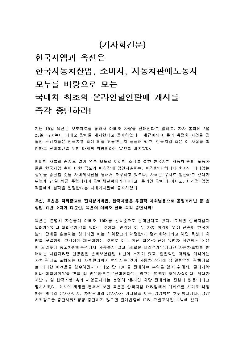 Çѱ¹Áö¿¥ÆÇ¸Å³ëµ¿ÀÚÀÇ º¶û ³¡ ±Ù¹« ¿©°Ç °³¼±¿¡´Â ´« °¨°í, ´«¹° ³ª´Â Çö½Ç¿¡¼ °í±ººÐÅõÇÏ´Â ÆÇ¸Å³ëµ¿ÀÚ¸¦ ¹è½ÅÇÏ´Â ¿Â¶óÀÎ ÆÇ¸Å¸¦ ½ÃµµÇÏ´Â Çѱ¹Áö¿¥°ú, ÀÚµ¿Â÷ À¯Åë½ÃÀåÀÇ Æ¯¼º°ú Çѱ¹ÀÇ ÀÚµ¿Â÷ÆÇ¸Å³ëµ¿ÀÚÀÇ Çö½ÇÀ» ÀνÄÇÏÁö ¸øÇϰí, ±× ¿µ¾÷»ç¿øÀÇ ¼ö´çÀ» ³ë¸®´Â Àú¿ÇÑ »ç¾÷ÀÎ ÀÚµ¿Â÷ ¿Â¶óÀÎ ÇÒÀÎÆÇ¸Å¸¦ ±âµµÇÏ´Â ¿Á¼ÇÀº, ´çÀå ¾Æº£¿À ÇÒÀÎ ÆÇ¸Å¸¦ Áß´ÜÇϰí, ÀÚµ¿Â÷ÆÇ¸Å³ëµ¿ÀÚ¿¡°Ô »çÁËÇϰí, Ã¥ÀÓÀÚ¸¦ ó¹úÇ϶ó! ¸¸¾à ¿ì¸®ÀÇ Á¤´çÇÑ ¿ä±¸¿¡ ÀÀÇÏÁö ¾Ê°í ÆÇ¸Å¸¦ °ÇàÇÑ´Ù¸é, Çѱ¹Áö¿¥ÆÇ¸Å³ëµ¿Á¶ÇÕÀº ÆÇ¸Å ³ëµ¿ÀÚÀÇ »ýÁ¸±ÇÀ» ¼öÈ£ÇÏ´Â Â÷¿ø¿¡¼, Àǹý Á¶Ä¡Çϰí, ¾Æº£¿À ÆÇ¸Å °ÅºÎ¿Í ¿Á¼Ç¿¡ ´ëÇÑ ºÒ¸Å¿îµ¿¿¡ µ¹ÀÔÇÒ °ÍÀ» °ËÅäÇÒ ¼ö¹Û¿¡ ¾ø´Ù´Â °ÍÀ» °æ°íÇÑ´Ù.