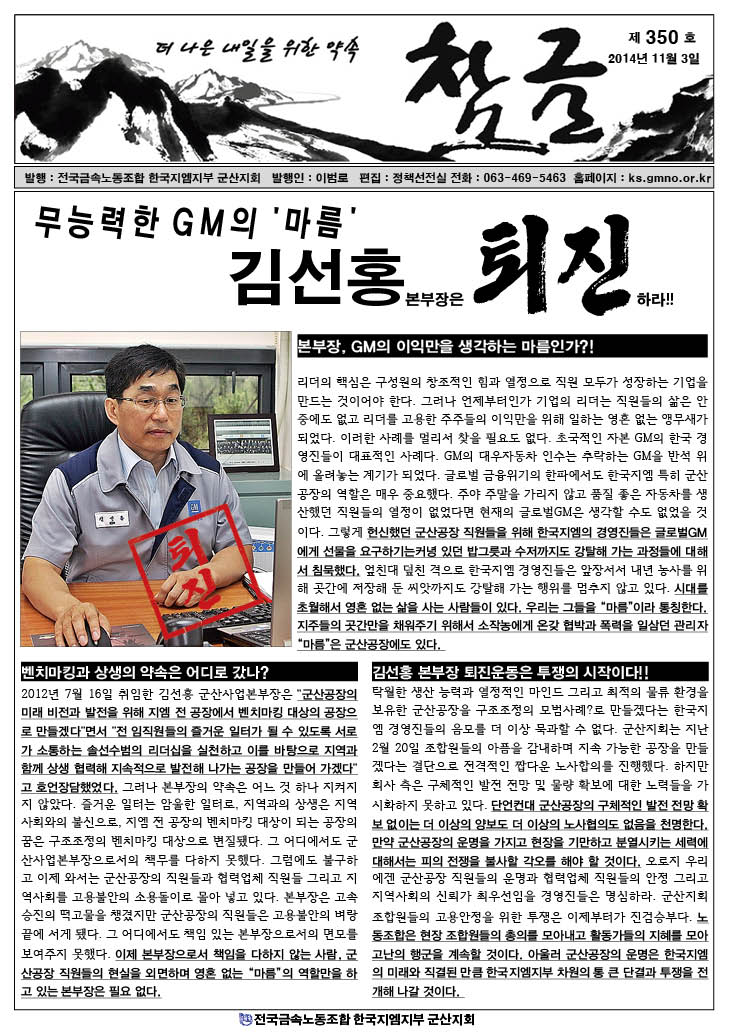 ±º»ê¹®Á¦´Â óÀ½ºÎÅÍ Â¬ ÇùÀÇÇÒ¶§ºÎÅÍ ¹®Á¦¿´´Ù 54Àâ¿¡¼ ±×°Íµµ ´ÜÄ®¿¡35Àâ ÇѽÉÇÑ Çù»ó¿´´Ù ȸ»ç°¡ ¾î·Á¿ö¼54Àâ¿¡¼ Àâ´Ù¿î Çù»óÀ» ¿äûÇßÀ¸¸é ³ëµ¿Á¶ÇÕÀº ÃÖ¼ÒÇÑ Á¶ÇÕ¿øµé »ýÁ¸±Ç À»ÁöŰ·Á°í Çß´Ù¸é35À⸻°í 45ÀâÀ¸·Î Çù»óÀ» Çß¾î¾ß Çß´Ù ±×·±µ¥ ´ÜÇѹø¿¡ 35Àâ ÇÑ´Ù°í ³ëµ¿Á¶ÇÕ¿¡¼ »çÃø¿¡ Å뺸¸¦Çß´Ù Á¤¸»·Î Á¶ÇÕ¿øµéÀº ÀÌ·± ³ëµ¿Á¶ÇÕÀÌ ¿ø¸Á½º·´´Ù ±×·±µ¥ À̹ø11¿ù ±Ù¹«°èȹµµ »çÃø¿¡¼ ³ëµ¿Á¶ÇÕ°ú ¾Æ¹«·± ÇùÀǵµ ¾øÀÌ ÀϹæÀûÀ¸·Î ÇöÀå¿¡ ¹èÆ÷Çß´Ù°í ÀÌÀç¿Í¼ º»ºÎÀå ÅðÁøÀ» ¿ÜÄ¡°í ÀÖ´Ù ±×·¯¸é¼ ³ëµ¿Á¶ÇÕÀº ½½±×¸Ó´Ï 11¿ù±Ù¹«¸¦ »çÃøÀÌ ÇÏÀڴµ¥·Î ±×³É°£´Ù ±×·¯¸é¼ º»ºÎÀå ÅðÁøÀ̶ó°í ÇÏ´Ï Á¶ÇÕ¿øµéÀº ¿ôÀ»¼ö ¹Û¿¡ ¾ø´Ù ³ëµ¿Á¶ÇÕÀº ³ëµ¿Á¶ÇÕ ¿ªÈ°ÀÌ ÀÖ´Ù Á¤¸»·Î ´ä´äÇÏ´Ù...