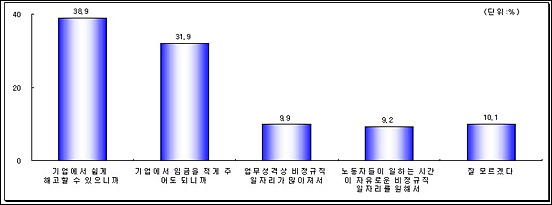 À̾î \'ºñÁ¤±ÔÁ÷ÀÌ ¿Ö ´Ã¾î³´Ù°í »ý°¢Çϴ°¡?\'¶õ Áú¹®¿¡ \'±â¾÷¿¡¼ ÇØ°í¸¦ ½±°Ô Çϱâ À§Çؼ\'°¡ 38.9%, \'ÀÓ±ÝÀ» Àû°Ô Á־ µÇ´Ï±î\' 31.9%, \'¾÷¹«¼º°Ý»ó ºñÁ¤±ÔÁ÷ÀÇ ÀÏÀÚ¸®°¡ ¸¹¾ÆÁ®¼\'°¡ 9.9%¿´À¸¸ç, \'³ëµ¿ÀÚµéÀÌ ÀÏÇÏ´Â ½Ã°£ÀÌ ÀÚÀ¯·Î¿î ºñÁ¤±ÔÁ÷ ÀÏÀÚ¸®¸¦ ¿øÇؼ\'´Â 9.2%, \'Àß ¸ð¸£°Ú´Ù\'´Â 10.1%·Î Á¶»çµÆ´Ù.