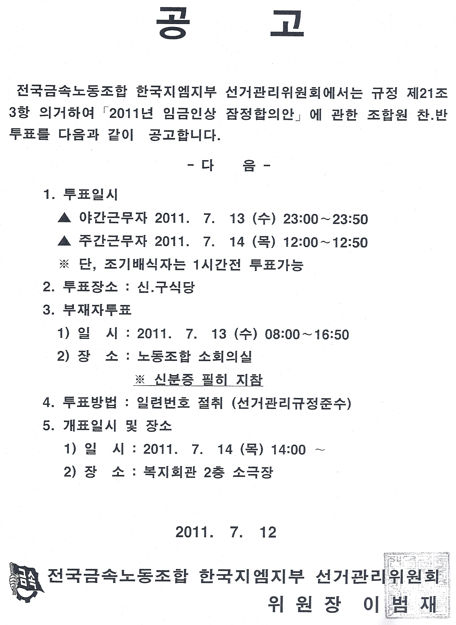[°ø°í] 2011³â ÀÓ±ÝÀλó ÀáÁ¤ÇÕÀÇ¾È Âù¹ÝÅõÇ¥°ø°í