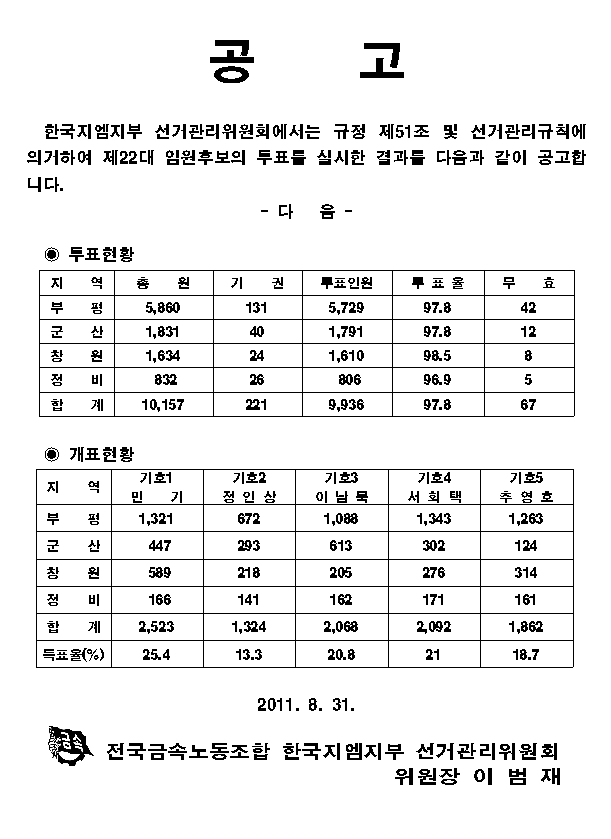 [°ø°í] 22 ÀÓ¿ø¼±°Å ÅõÇ¥ °á°ú