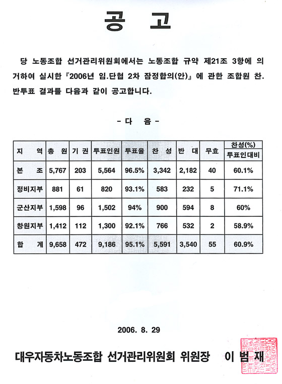 2006³â 2Â÷ ÀáÁ¤ÇÕÀÇ(¾È) Âù¹ÝÅõÇ¥ °á°ú