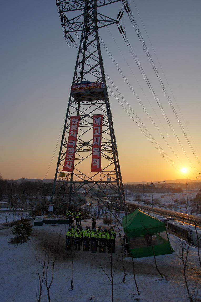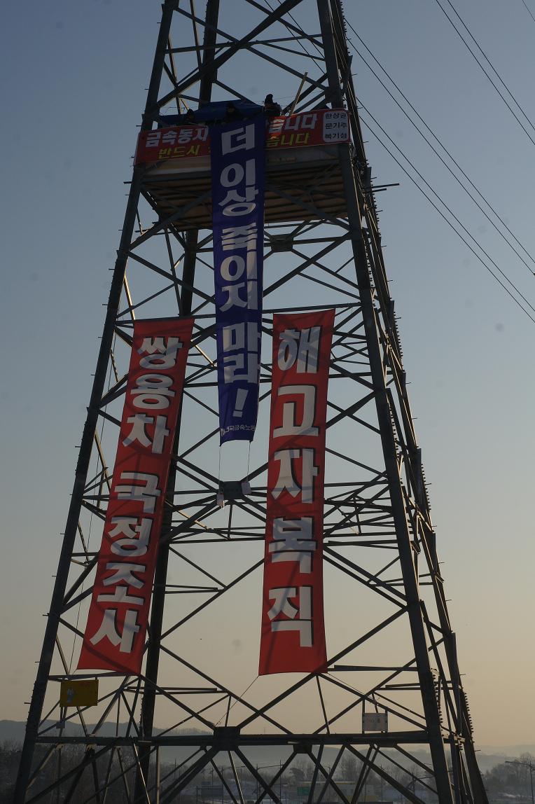'ÇØ°íÀÚ º¹Á÷''½Ö¿ëÂ÷ ±¹Á¤Á¶»ç'Çö¼ö¸· ¹Ù·Î À§,»õÁý°°Àº ÀÛÀº °ø°£ÀÌ º¸¿´´Ù.ÁöºØ°ú º®µµ ¾øÀÌ ÇÕÆÇ ¸î À常 ±ò¾Æ³õÀº°÷ ¹Ù·Î ½Ö¿ëÂ÷ ¹®Á¦ ÇØ°áÀ» Ã˱¸Çϸç Áö³ 11¿ù 20ÀϺÎÅÍ ½ÃÀÛµÈ '°í°ø öž³ó¼ºÀå'ÀÌ´Ù. ¾à 30m ³ôÀÌ¿¡¼ 2009³â ¿Á¼âÆÄ¾÷À» À̲ø´ø ÇÑ»ó±Õ(51) Àü ½Ö¿ëÂ÷ ³ëÁ¶ÁöºÎÀå, ¹®±âÁÖ Á¤ºñÁöȸÀå, º¹±â¼º ºñÁ¤±ÔÁöȸ ¼ö¼®ºÎÁöºÎÀåÀÌ °í°ø³ó¼ºÀ» ¹úÀ̰í ÀÖ´Ù. Àü±¹¿¡¼ ¸ðÀÎ ±Ý¼Ó³ëÁ¶ Á¶ÇÕ¿øµéÀÌ ¼ÛÀüž ¾Õ¿¡ õ¸·À» Ä¡°í 1¹ÚÀ» ÇÑ ÈİáÀÇ´ëȸ¸¦ ÁøÇàÇϰí ÀÖ´Ù.2012³â 12¿ù8ÀÏÇѱ¹Áö¿¥ÁöºÎ