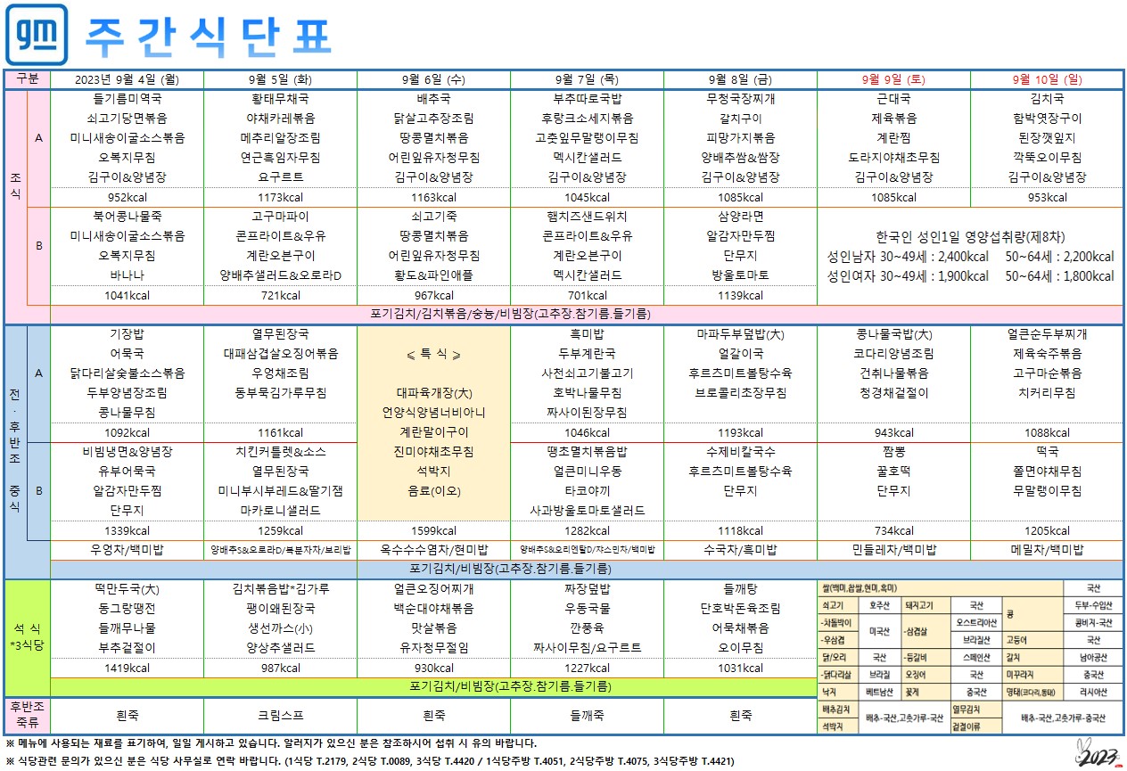 2023³â09¿ù 04ÀÏ~09¿ù 10ÀÏ ÁÖ°£½Ä´ÜÇ¥ ÀÔ´Ï´Ù.
