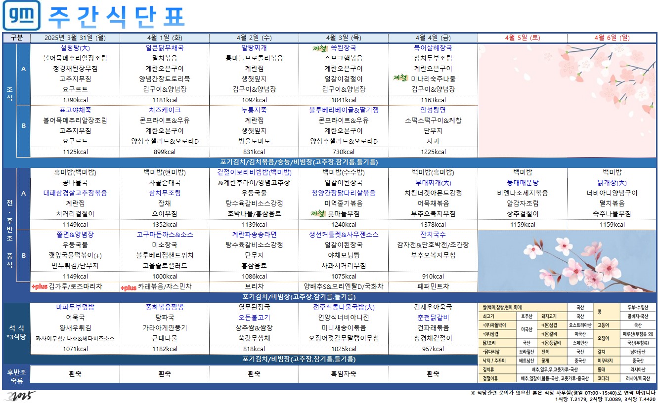 2025³â 3¿ù 31ÀÏ ~ 4¿ù 6ÀÏ ÁÖ°£ ½Ä´ÜÇ¥ÀÔ´Ï´Ù.