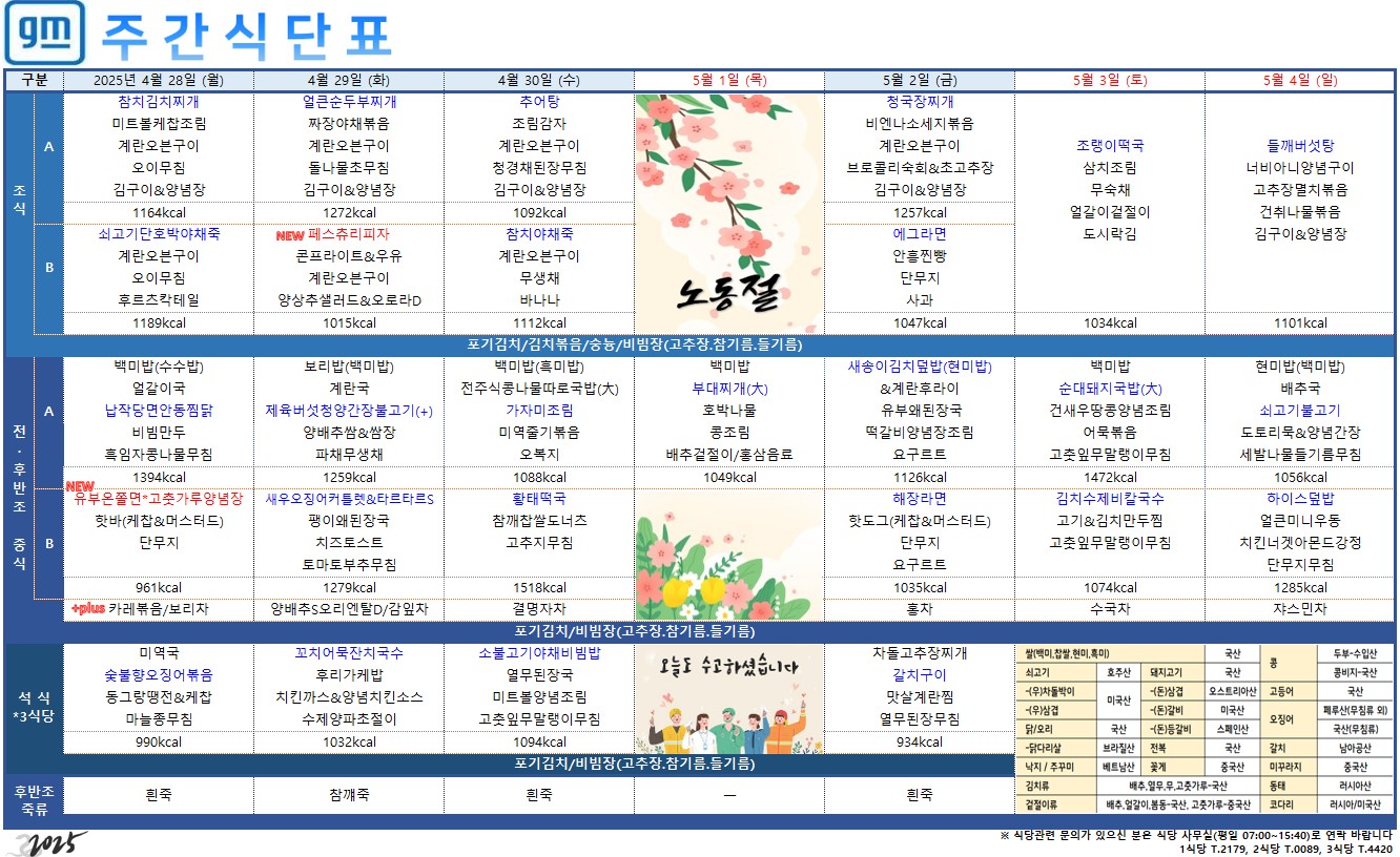 2025³â 4¿ù 28ÀÏ ~ 5¿ù 4ÀÏ ÁÖ°£ ½Ä´ÜÇ¥ÀÔ´Ï´Ù.