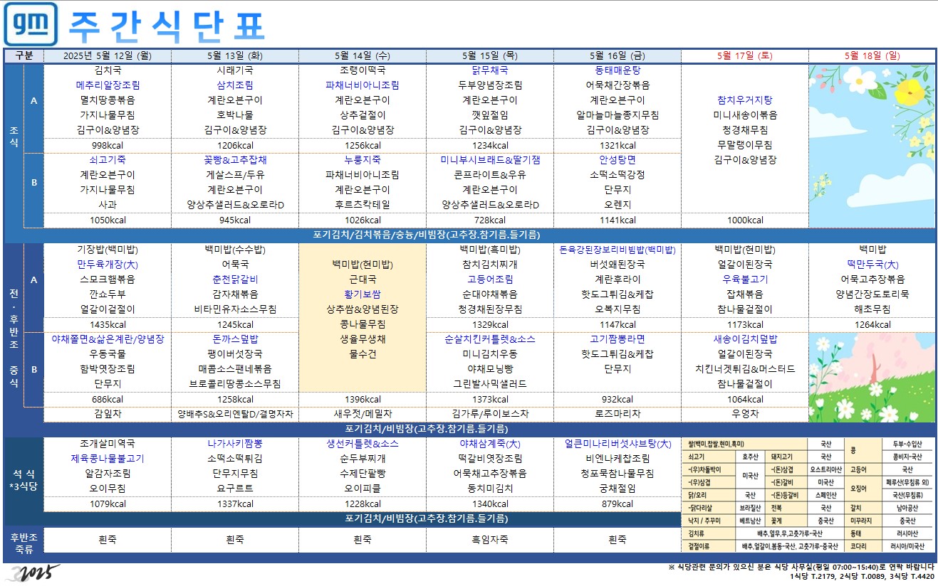 2025³â 5¿ù 12ÀÏ ~ 5¿ù 18ÀÏ ÁÖ°£ ½Ä´ÜÇ¥ÀÔ´Ï´Ù.