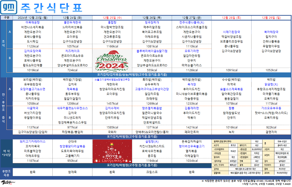 2024³â 12¿ù 30ÀÏ ~ 2025³â 1¿ù 5ÀÏ ÁÖ°£½Ä´ÜÇ¥ ÀÔ´Ï´Ù.