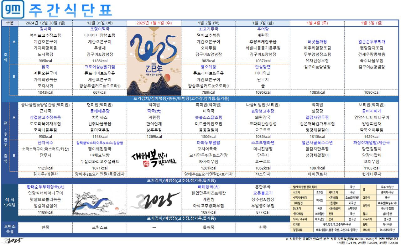 2024³â 12¿ù 30ÀÏ ~ 2025³â 1¿ù 5ÀÏ ÁÖ°£½Ä´ÜÇ¥ ÀÔ´Ï´Ù.