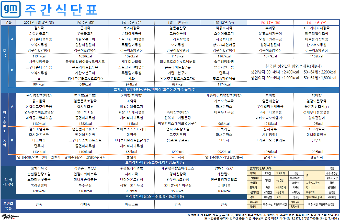 2024³â 1¿ù 8ÀÏ~1¿ù 14ÀÏ ÁÖ°£½Ä´ÜÇ¥ ÀÔ´Ï´Ù.