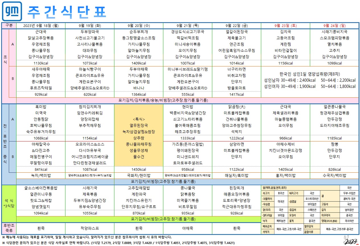 2023³â09¿ù 18ÀÏ~09¿ù 24ÀÏ ÁÖ°£½Ä´ÜÇ¥ ÀÔ´Ï´Ù.
