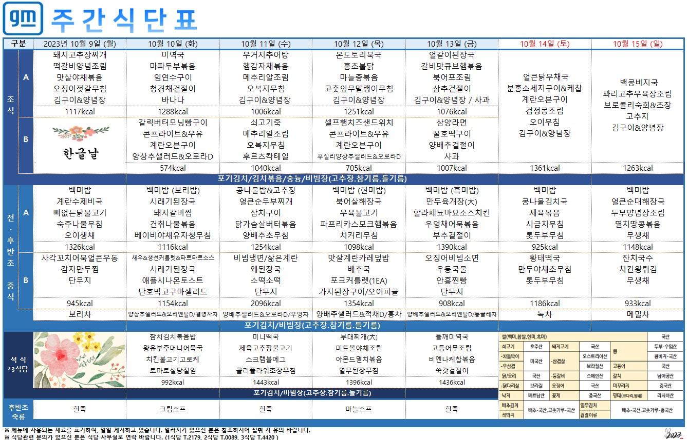 2023³â 10¿ù 16ÀÏ~10¿ù 22ÀÏ ÁÖ°£½Ä´ÜÇ¥ ÀÔ´Ï´Ù.