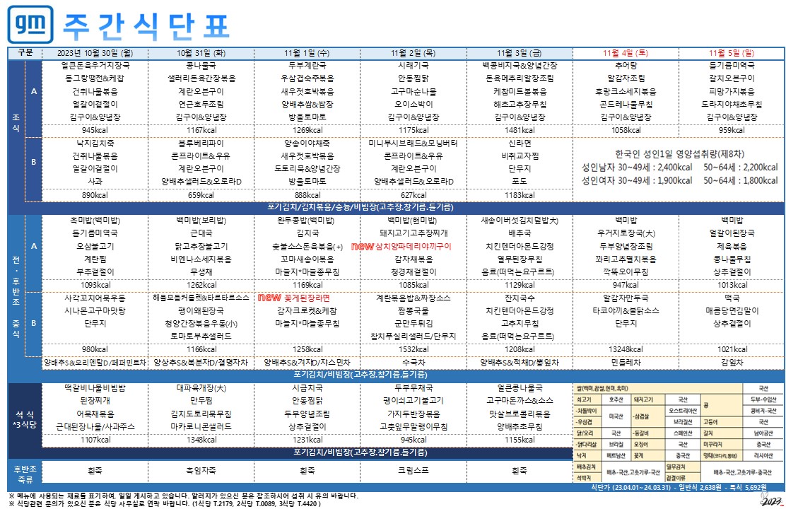 2023³â 10¿ù 30ÀÏ~11¿ù 05ÀÏ ÁÖ°£½Ä´ÜÇ¥ ÀÔ´Ï´Ù.