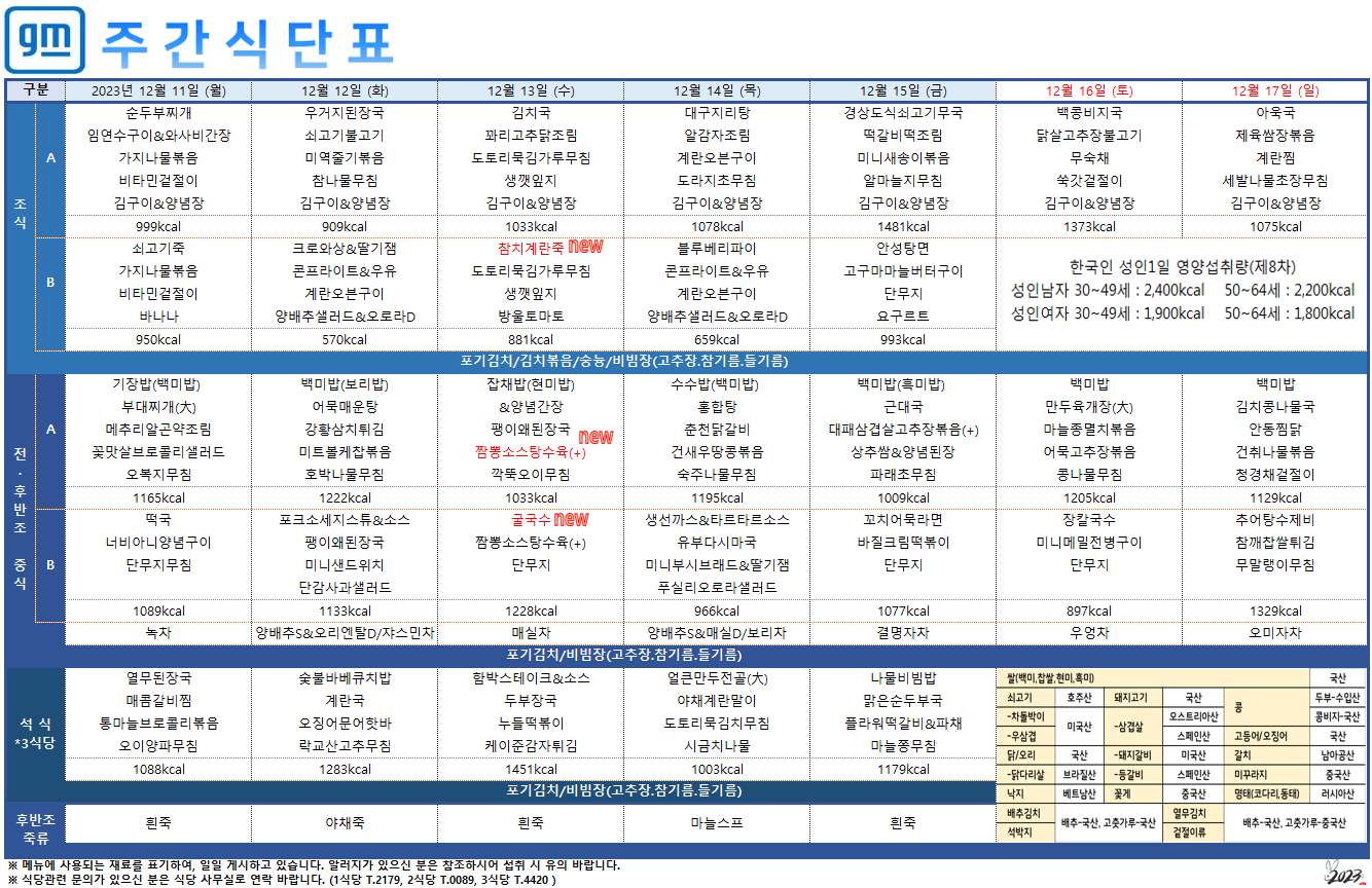 2023³â 12¿ù 11ÀÏ~12¿ù 17ÀÏ ÁÖ°£½Ä´ÜÇ¥ ÀÔ´Ï´Ù.